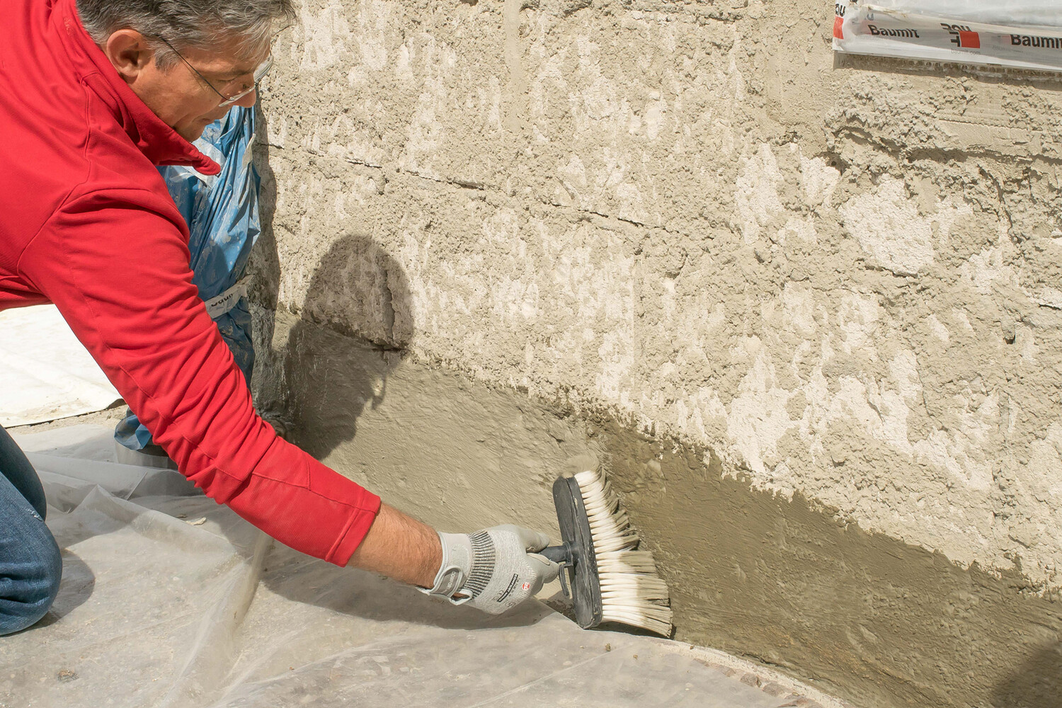 Alternativ raust du die Oberfläche der zweiten Lage Dichtschlämme nach leichtem antrocknen horizontal mit einem Straßenbesen auf und lässt diese für mindestens 3 Tage durchtrocknen. Anschließend trägst du auf die Dichtschlämme eine Haftspachtelung mit Baumit Multisockel Base in einer Putzdicke von ca. 5 mm auf und raust die Oberfläche ebenso mit einem Straßenbesen horizontal auf.