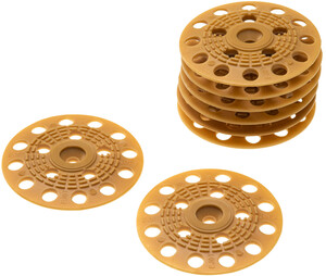 Dübelteller aus Hart-PVC mit einem Durchmesser von 60 mm zur Kombination mit Holzbauschrauben mit Senkkopf (max. Ø 5 mm). Zur zusätzlichen Befestigung von Dämmplatten an Innenwand und Außenfassade ohne wärmebrückenoptimierte Eigenschaften.