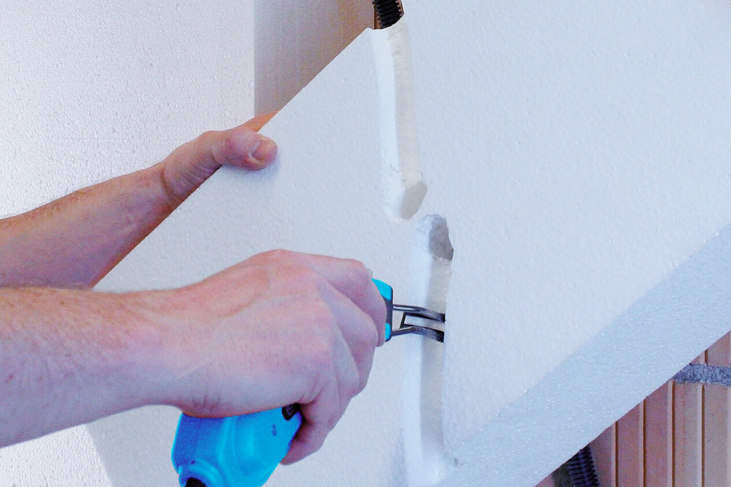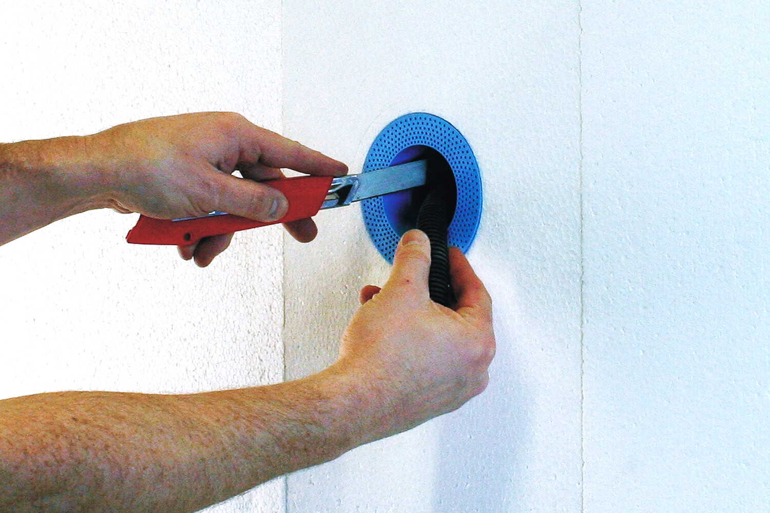 Set aus Gerätedosen und Fräswerkzeug für die einfache, sichere und wärmebrückenfreie Montage von Schaltern, Elektrodosen, Bewegungsmeldern und Temperaturfühlern in Fassadendämmplatten aus EPS oder Mineralwolle.