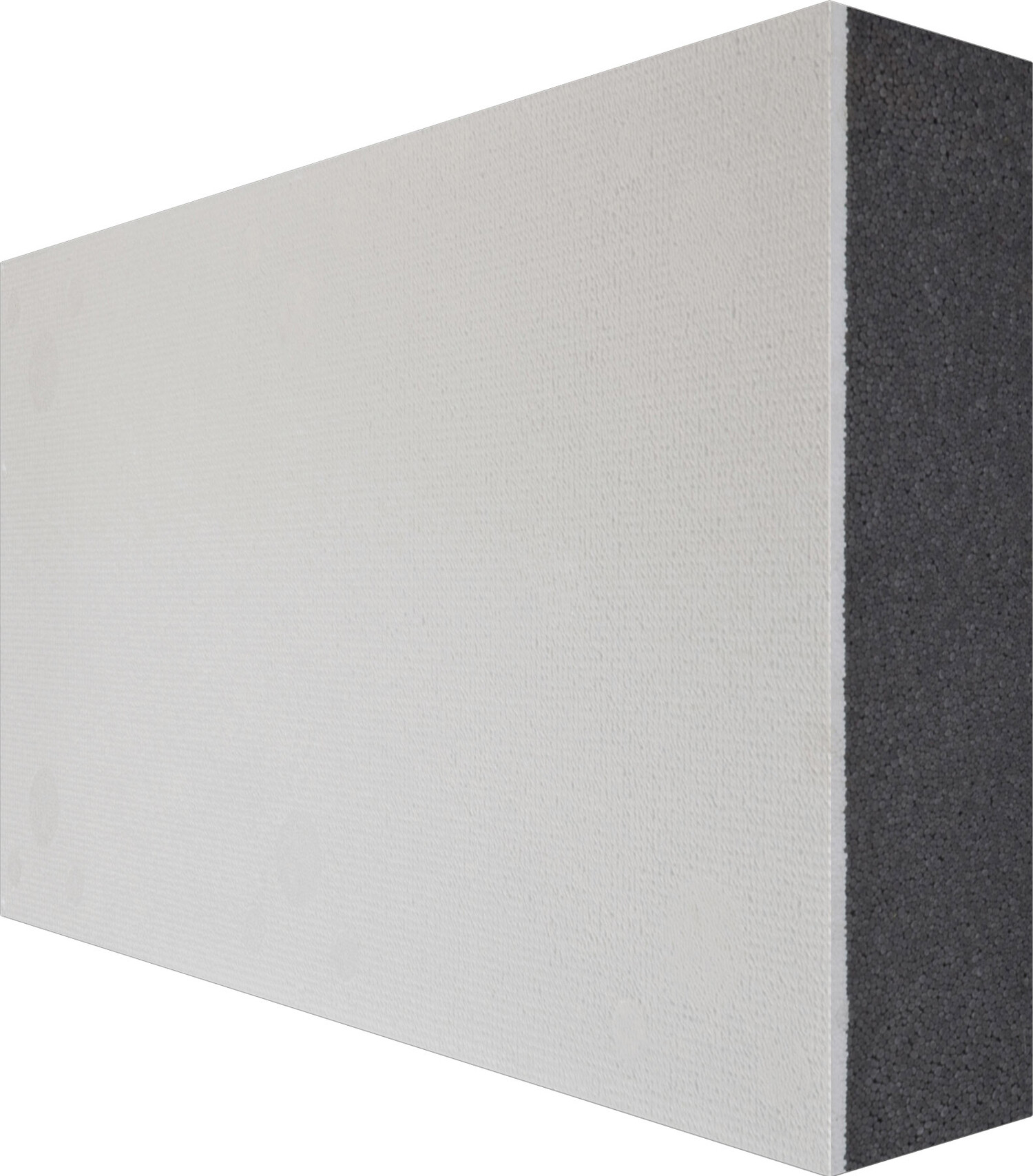 Graue, formstabile und schwundfreie Styropor-Fassadendämmplatte (WAP) mit stumpfer Kantenausbildung. Mit weißer Deckschicht und bauaufsichtlicher Zulassung im Baumit WDVS-System zum Verkleben an Wänden und Decken. Wärmeleitfähigkeit 0,032 W/(mK).