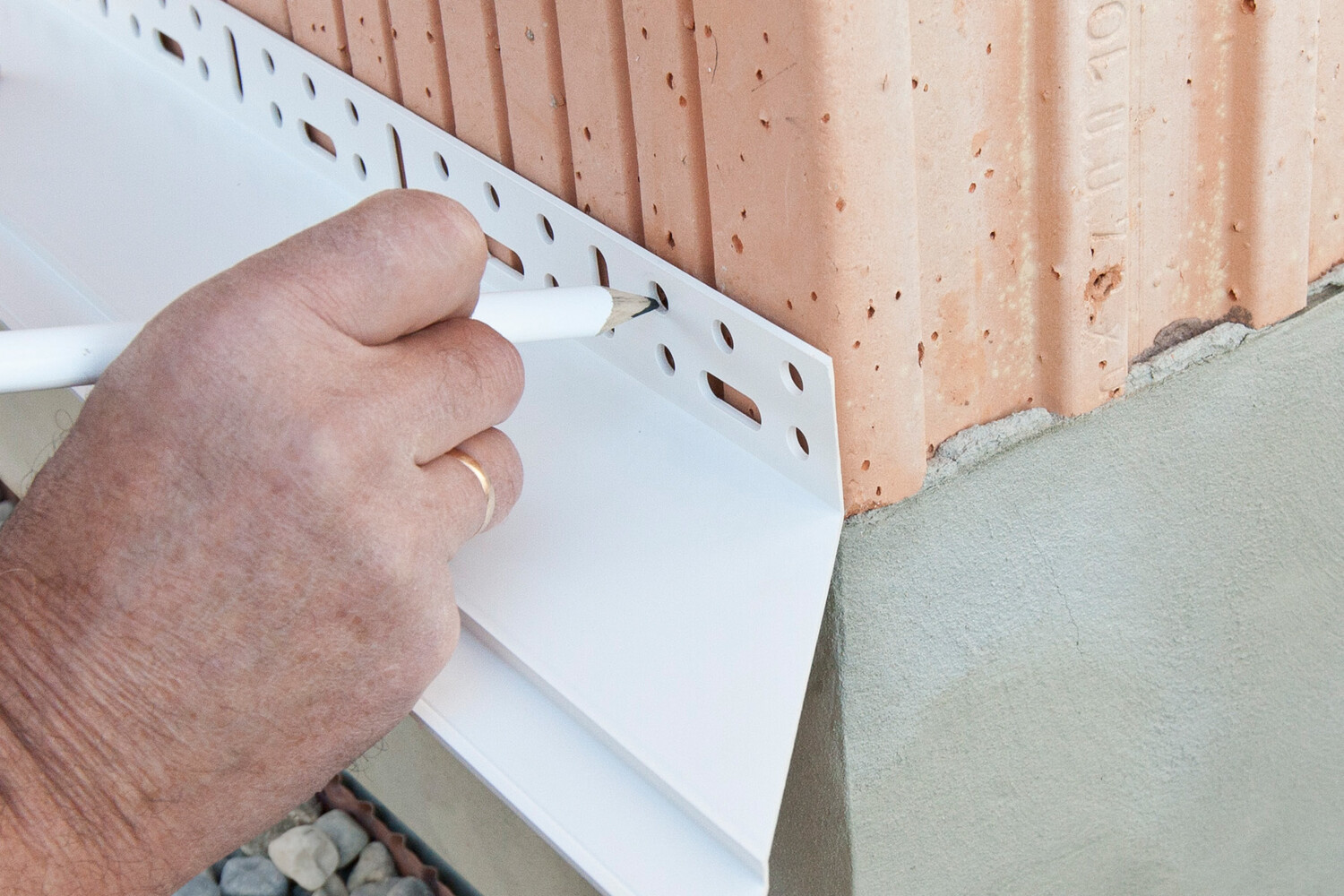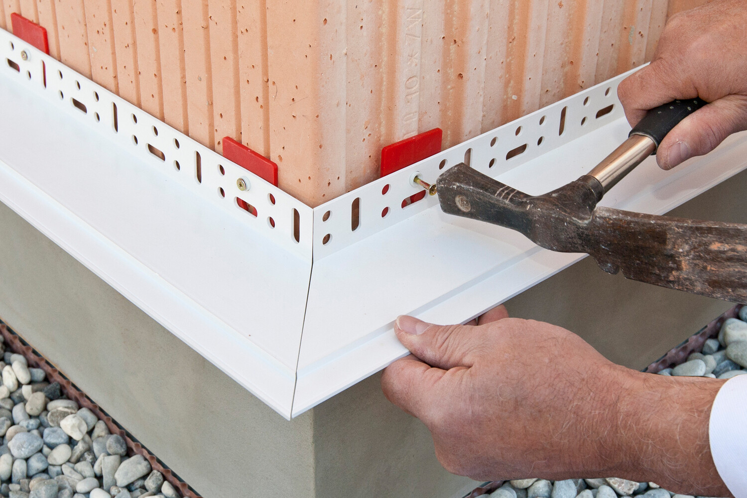 Für einen geraden Verlauf des Sockelprofils in einer Dämmfassade ist es sehr wichtig, dass das Sockelprofil absolut gerade am Untergrund ausgerichtet und montiert wird. In der Praxis ist aber kaum ein Untergrund so planeben, dass dies ohne den Einsatz von Ausgleichstücken möglich ist.