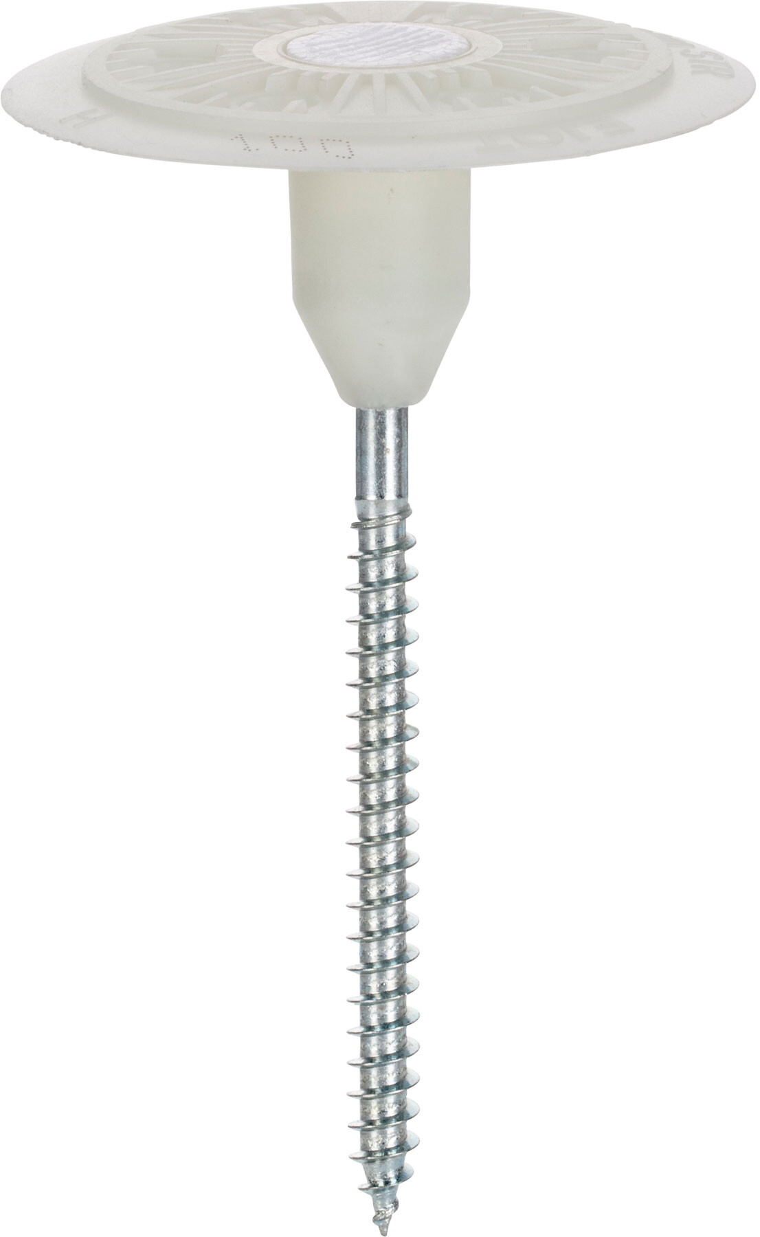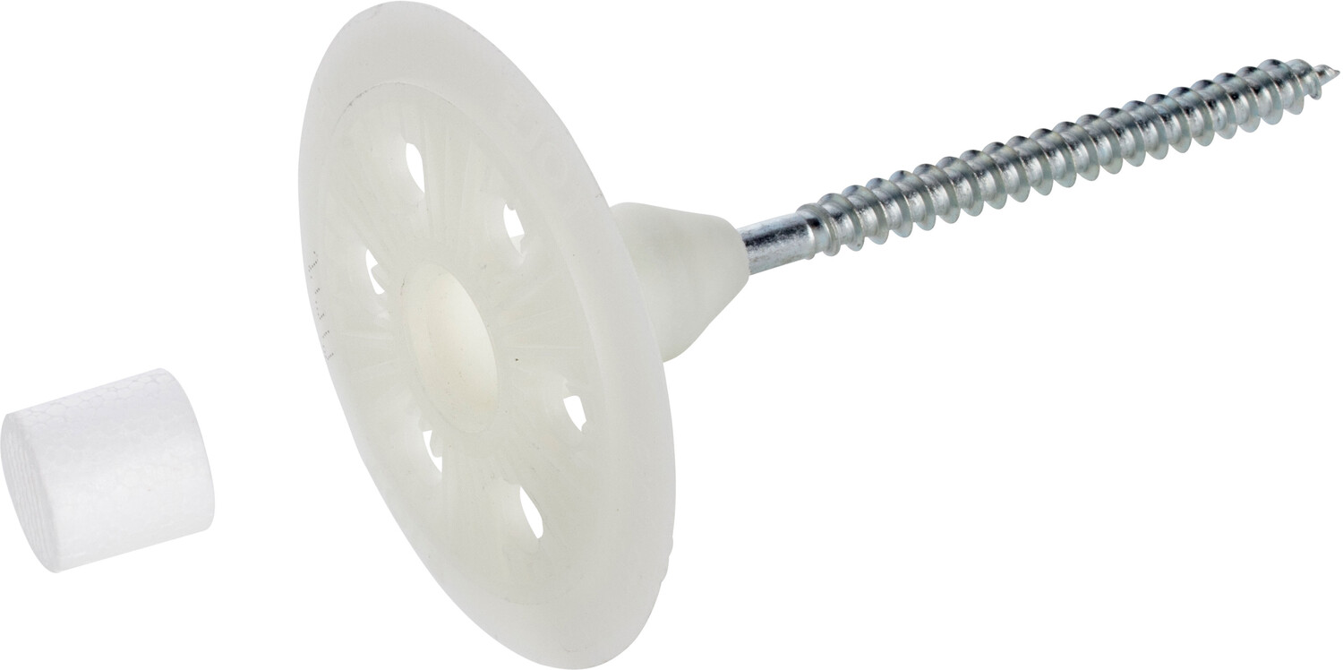 Wärmebrückenoptimierter Schraubdübel mit 60 mm Teller und korrosionssicherer Edelstahlschraube zur konstruktiven Montage von Mineralwolle / Steinwolle in Fassadendämmungen (WDVS) bei höheren Anforderungen an den Brandschutz, speziell in Holz und zugelassenen Holzbauplatten.
