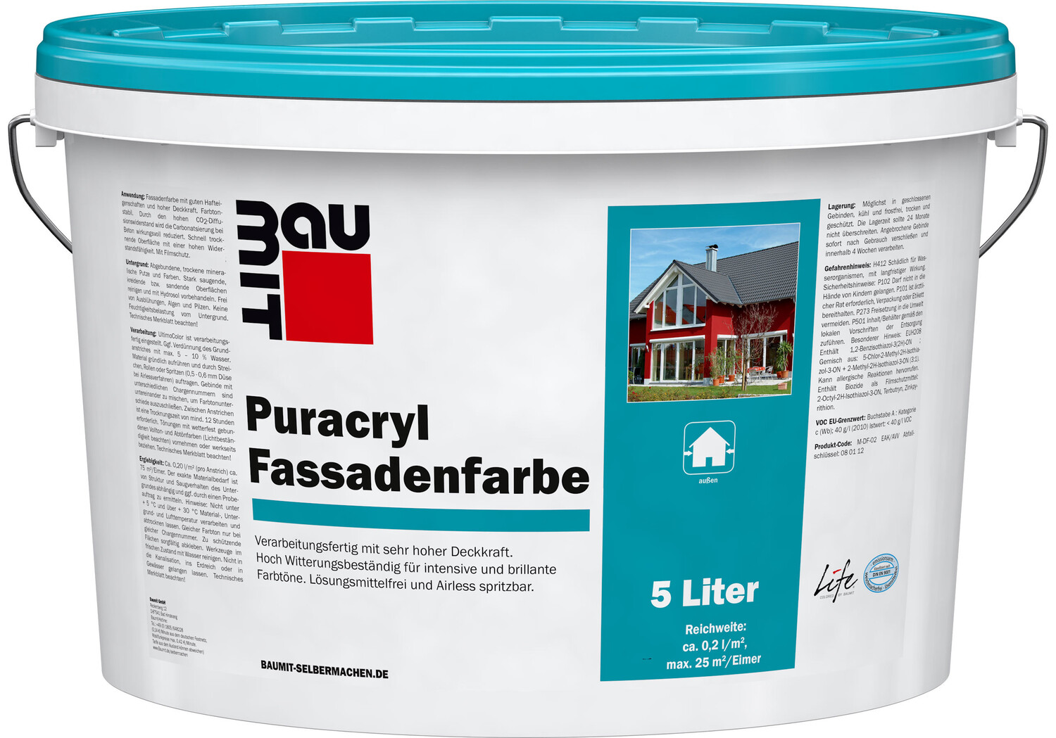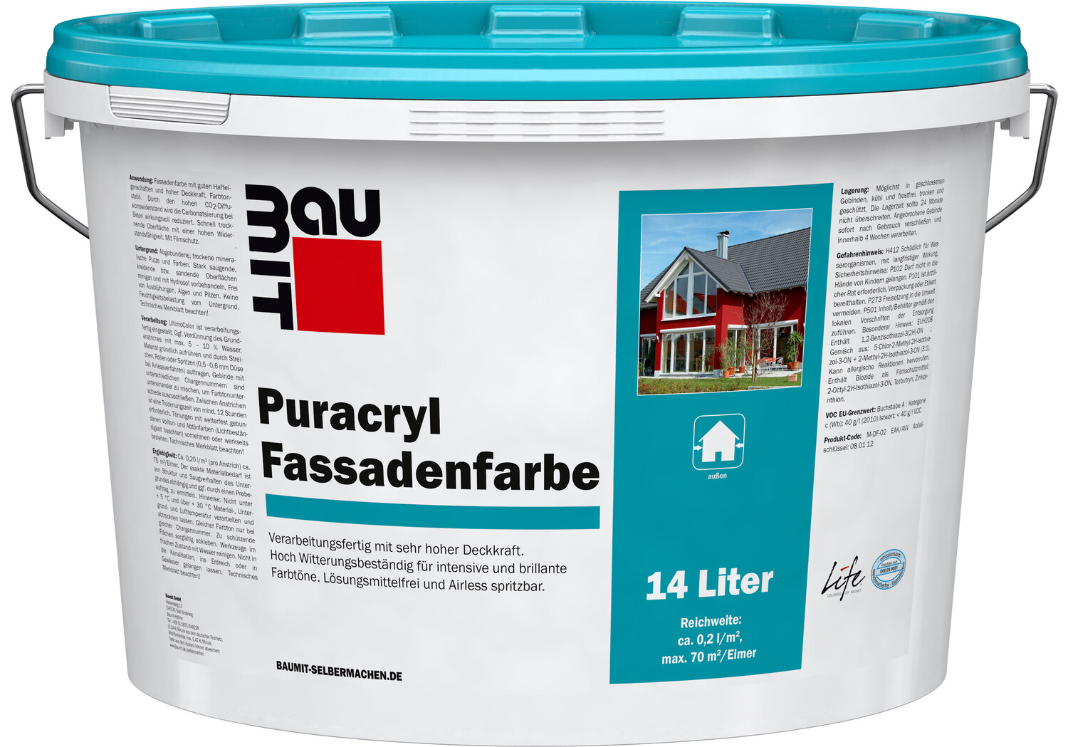 Hoch wasserabweisende Reinacrylat-Fassadenfarbe in Weiß oder in sehr intensiven, auch dunklen Farbtönen mit exzellenter Schutzwirkung vor Witterungseinflüssen. Universell im Neubau oder bei Renovierungen auf verschiedensten Untergründen, wie Strukturputze, Beton, Kalkzementputze, einsetzbar.