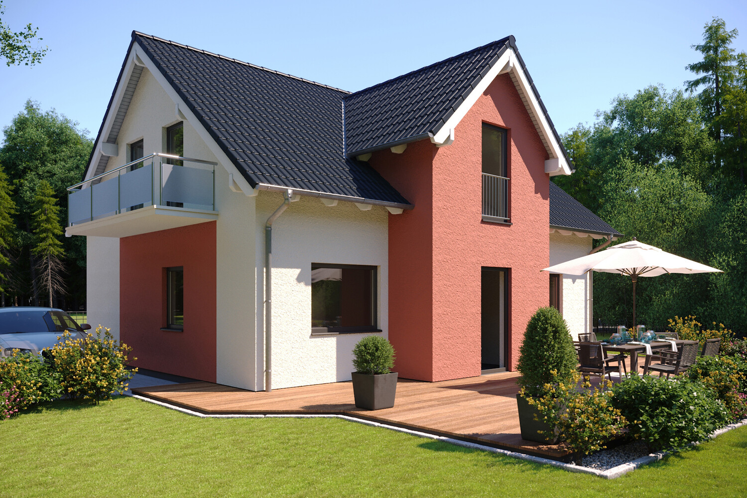 • ideale Fassadenfarbe für dunkle, intensive Farbtöne (z.B. Anthrazit, Grau, Rot)