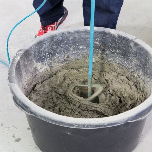 Anschließend gibst du den Klebespachtel hinzu und rührst ihn knötchenfrei an. Kleinere Mengen können von Hand (mit einer rostfreien Maurerkelle) angerührt werden. Für ganze Säcke empfehlen wir den Einsatz eines elektrischen Rührwerkes.