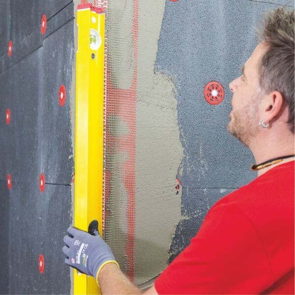 Prüfe die lotgerechte Lage des Gewebeeckwinkels mit einer Wasserwaage. Im Bedarfsfall entsprechend nacharbeiten und korrigieren.