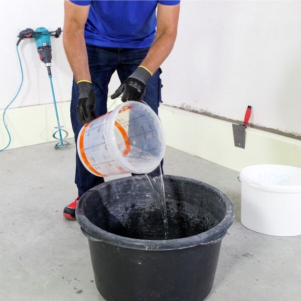 Zum Anrühren des Klebespachtels füllst du zuerst Wasser in einen sauberen Mörtelkübel o. ä.. Die empfohlene Wassermenge findest du in den Angaben auf der Sackrückseite oder im Technischen Merkblatt.