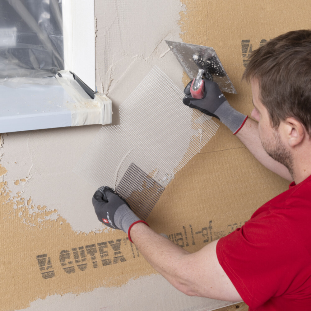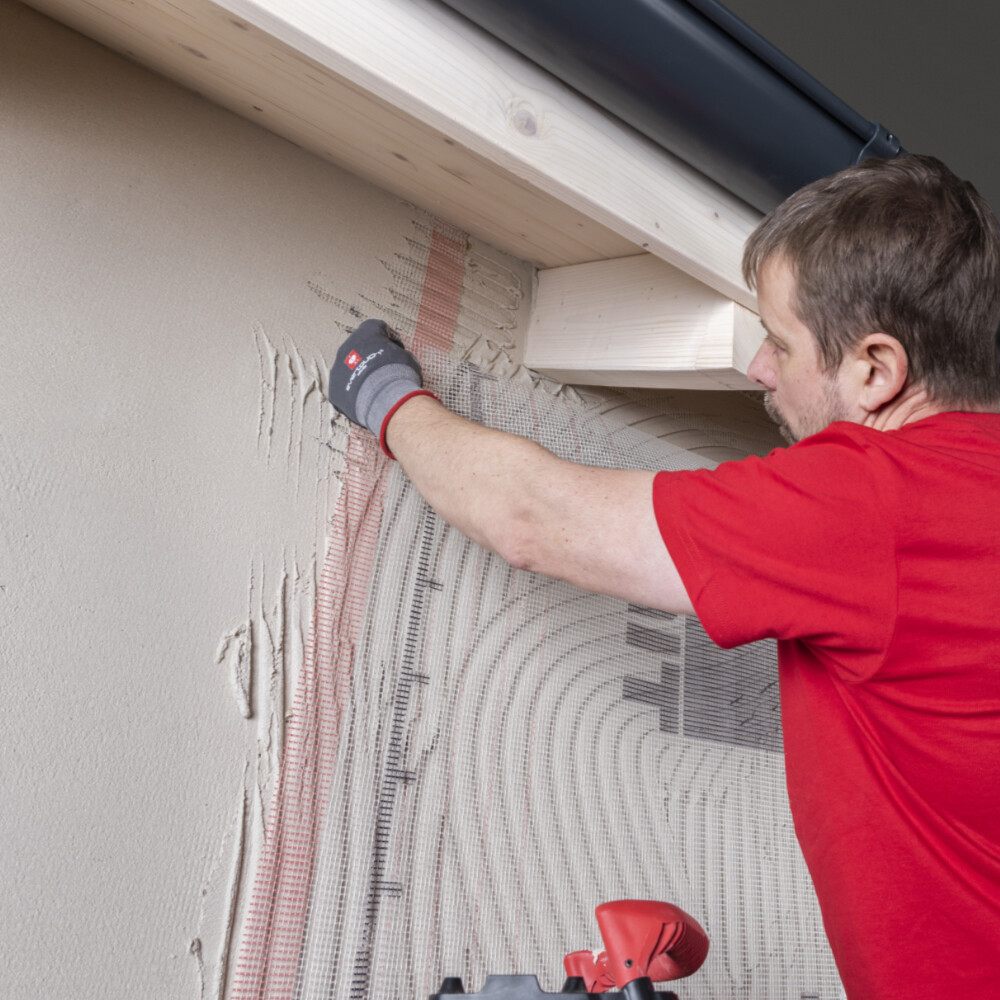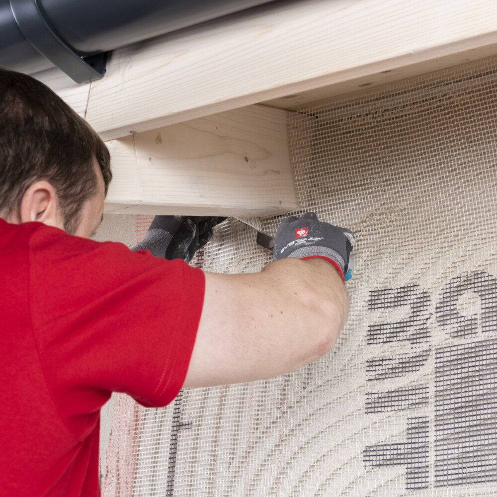 Im Bereich von Fenstern, Türen oder anderen Öffnungen schneidest du das überstehende Armierungsgewebe weg. Der Abstand des Gewebes zum Rand sollte nicht mehr als 20 mm betragen.