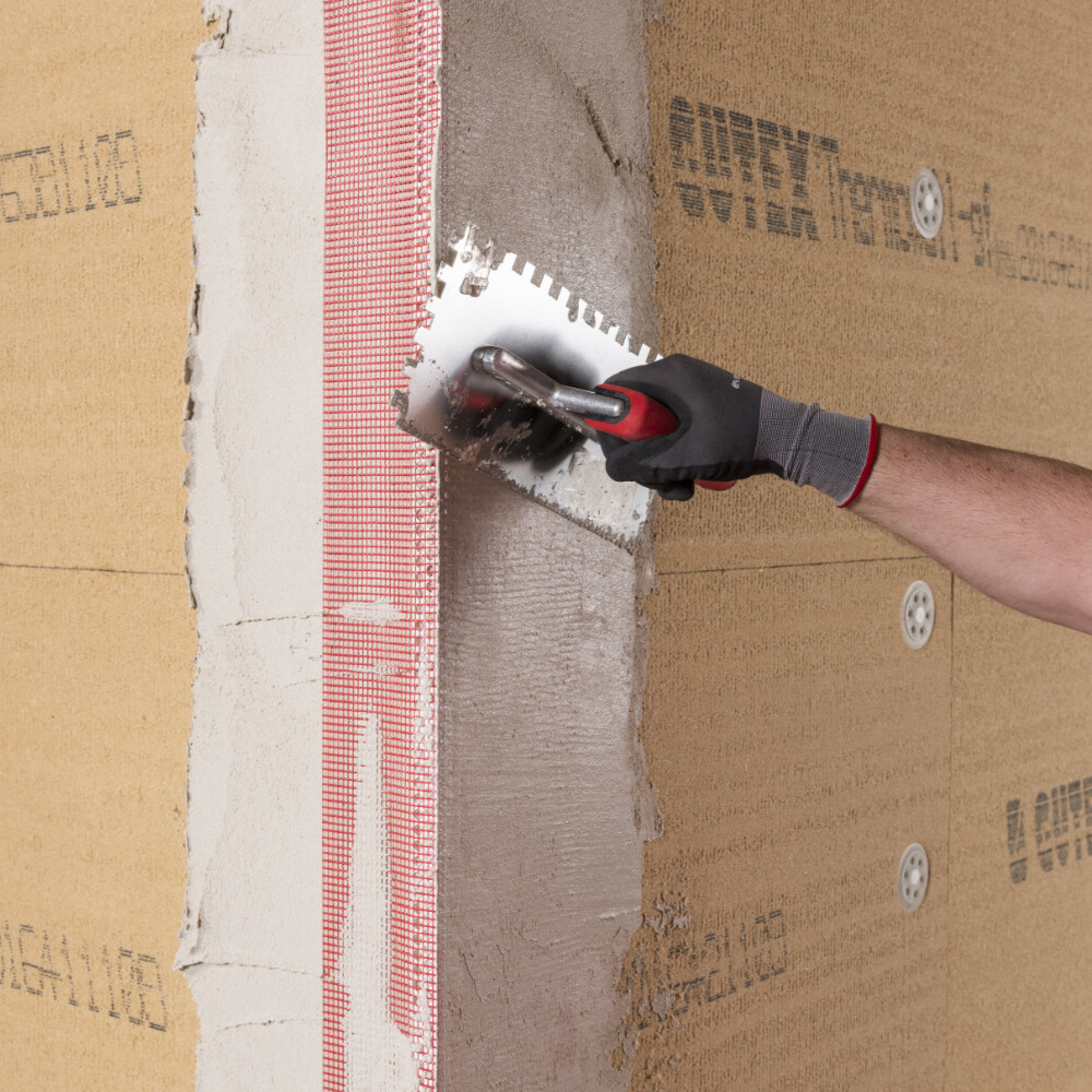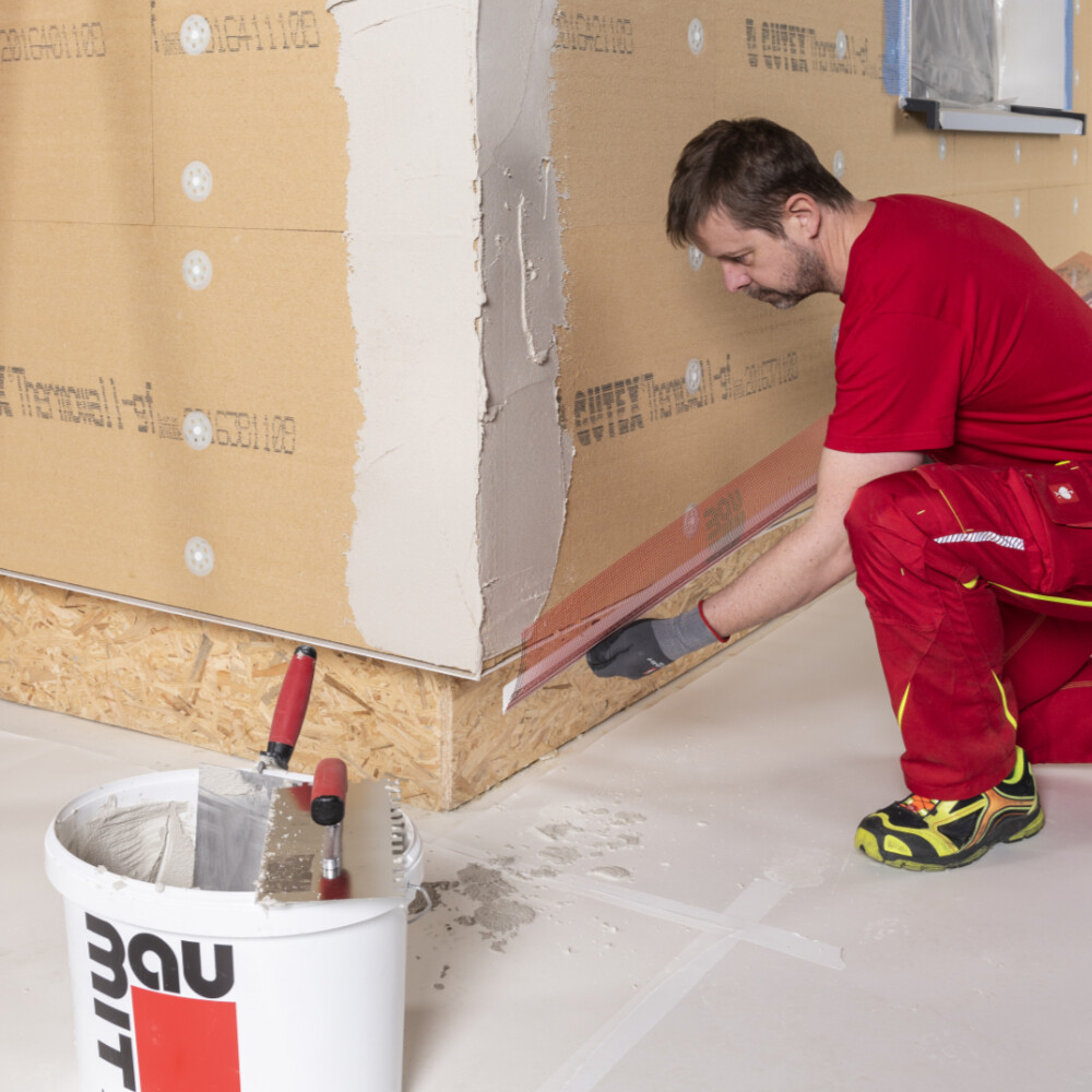 Schütze alle Außenkanten der Holzfaserdämmung mit Gewebeeckwinkeln vor Beschädigung. Mische dafür Baumit Multicontact entsprechend den Angaben auf der Gebinderückseite mit sauberem Wasser an und trage den frischen Spachtel im Kantenbereich mit einer rostfreien Glättkelle 2-3 mm dick auf.