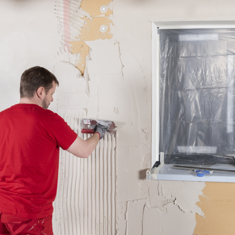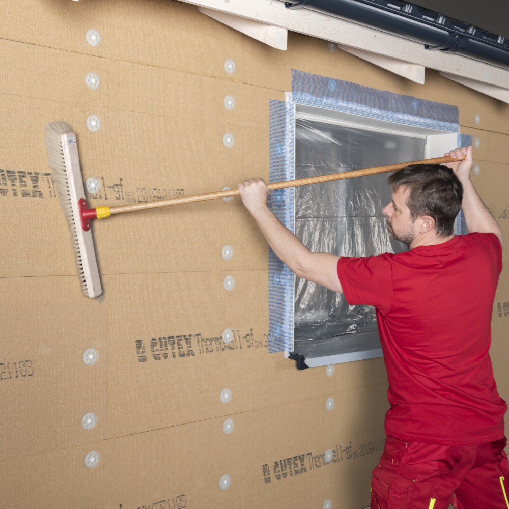 Der Armierungsspachtel ist alkalisch. Schütze dich während der Arbeiten mit entsprechender Arbeitsschutzkleidung (Schutzbrille, Arbeitshandschuhe, Arbeitskleidung). Verwende bei Arbeiten an der Fassade eine sichere Steighilfe, um Unfälle zu vermeiden.