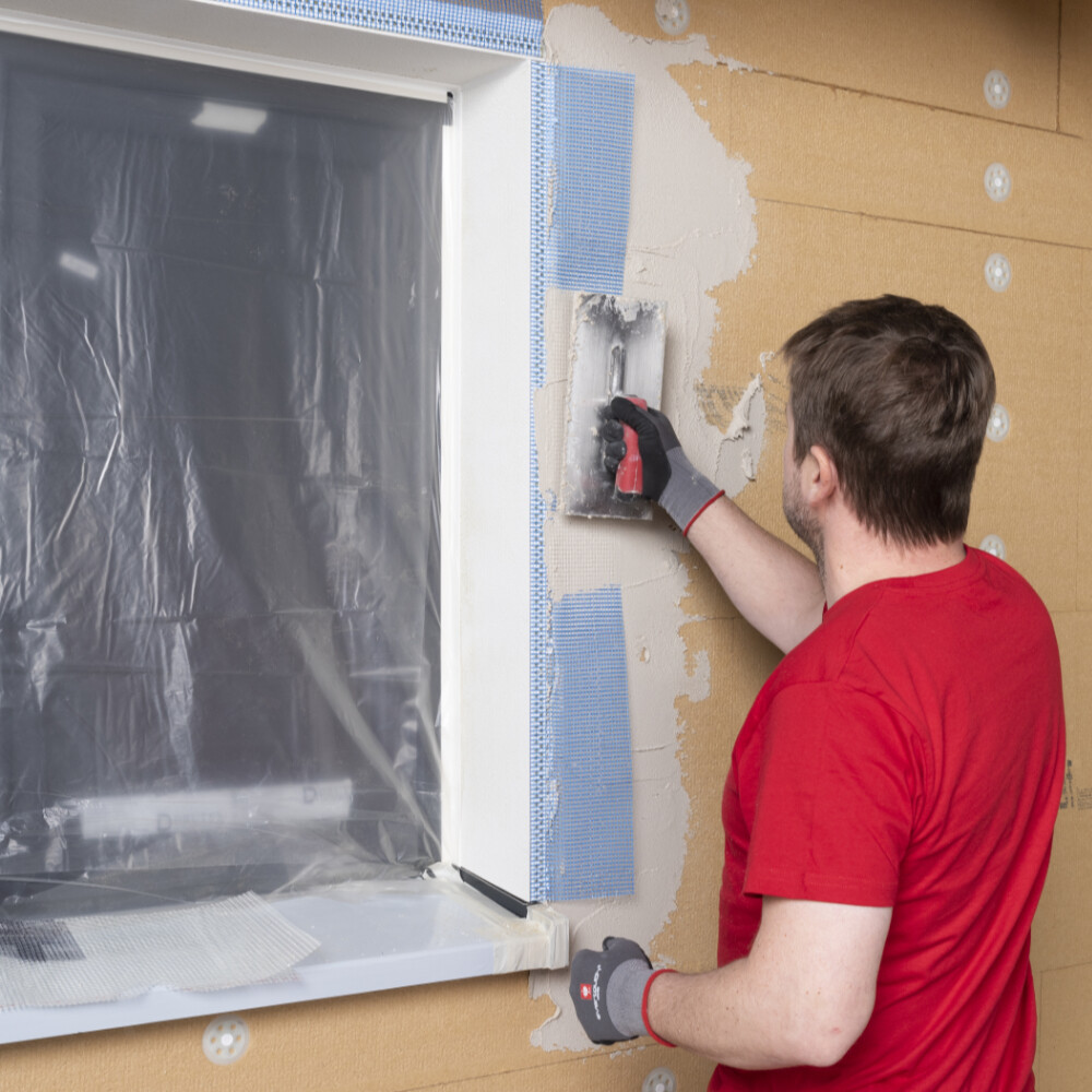 In unserem Beispiel haben wir vorgefertigte Laibungselemente mit integrierter Gewebefahne in den Laibungen eingesetzt. Auch diese Gewebefahne spachtelst du vollflächig in den frischen Armierungsspachtel ein.