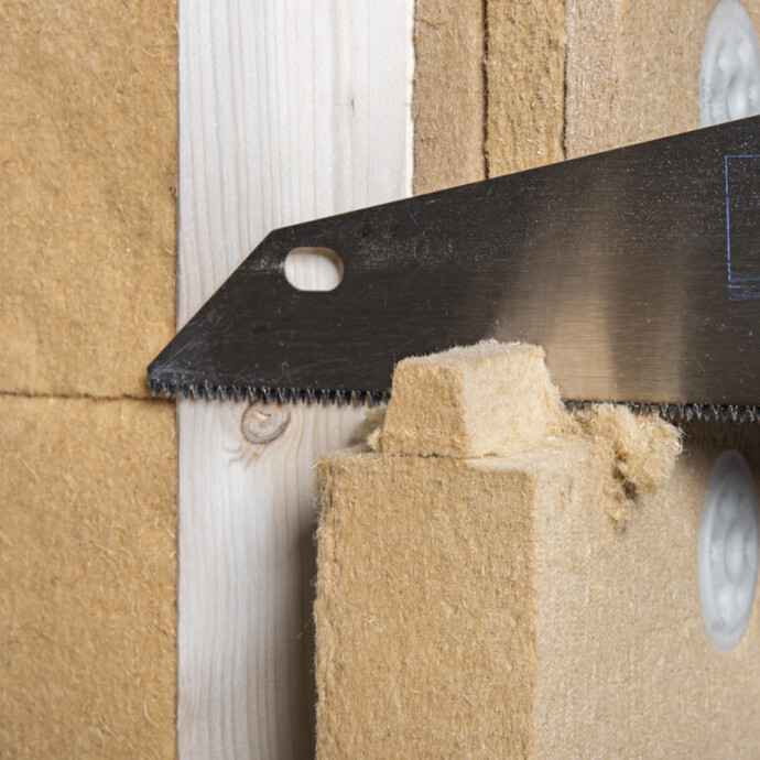 Du kannst die Holzdämmplatte mit einer handelsüblichen Handsäge auf Länge zuschneiden.