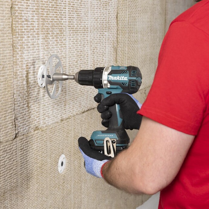 Drehe die Schraube mit einem Akku-Schrauber ein. Sobald die Anschlagscheibe des Setzwerkzeuges auf der Dämmplattenoberfläche aufliegt und sich nicht mehr dreht, sollte der Dübel tief genug eingedreht sein.