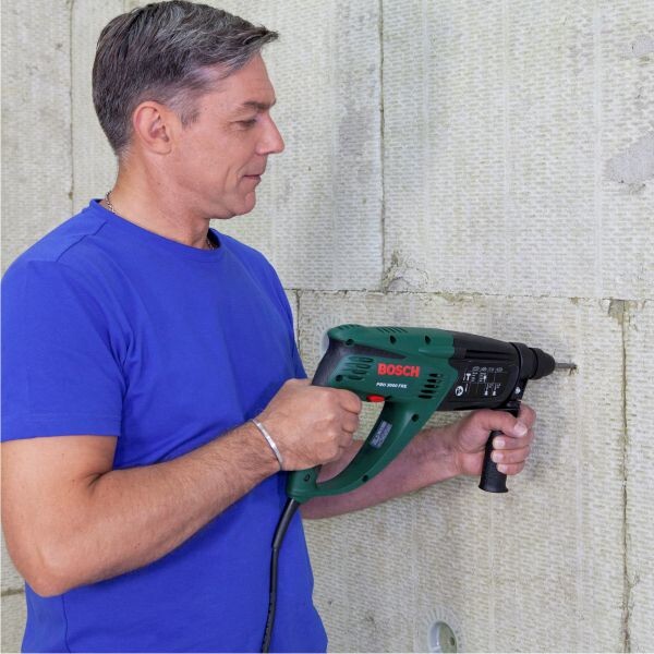 Verwende einen dem Untergrund entsprechenden Bohrer. Bei der versenkten Dübelmontage, wie hier gezeigt, beträgt die Bohrlochtiefe 50 mm, bei Porenbeton 90 mm im Mauerwerk. Bleibt der Altputz am Mauerwerk addierst du zu der Bohrlochtiefe die Dicke der Altputzlage hinzu. In der Regel sind dies 20 bis 30 mm.