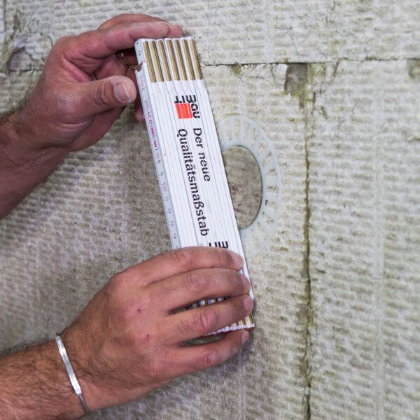 Prüfe im Anschluss mit einem Zollstock o. ä. die Oberflächenbündigkeit des zuvor eingeschraubten Dübels.