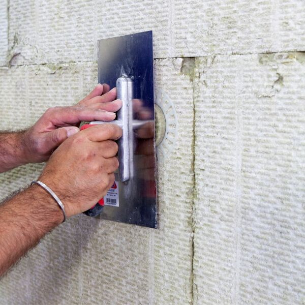Die Vertiefung wird abschließend mit einer Mineralwolle-Rondelle ausgefüllt. Wir empfehlen dir die Rondelle flächig zum Beispiel mit einer Glättkelle einzudrücken. Damit kannst du sicherstellen, dass die Rondelle tatsächlich oberflächenbündig abschließen.