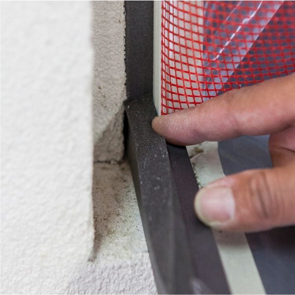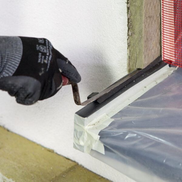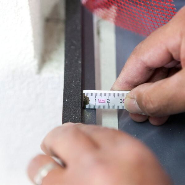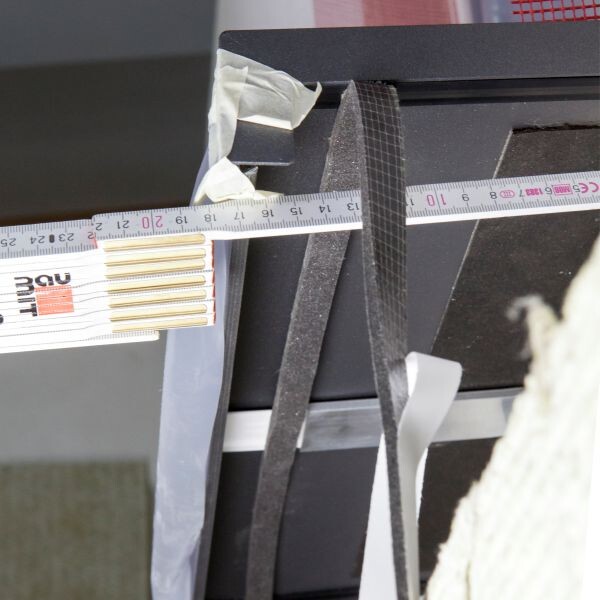 Berücksichtige bei der Länge die Dicke der späteren Fassaden-Dämmplatte sowie der Kleberschicht unter der Platte von ca. 6 - 10 mm. So bemessen soll das Fugendichtband später oberflächenbündig mit der Fassadendämmplatte abschließen.