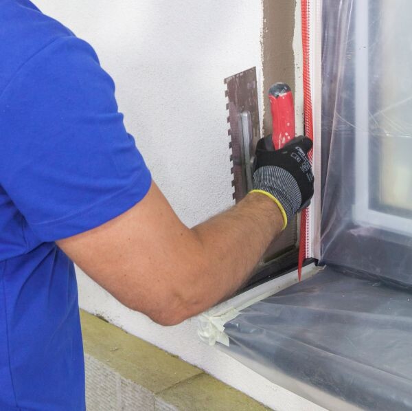 Anschließend trägst du vollflächig Kleber in die Laibung auf. Schneide mit einem Dämmstoffmesser oder einem Fuchsschwanz die Laibungsplatte nach Bedarf zu. Die Laibungsplatte soll direkt auf dem Fensterrahmen und der späteren Fassadendämmplatte aufliegen. Aus diesem Grund ist ca. 10 mm für die Kleberschicht der Fassadendämmplatte zu berücksichtigen. Beispiel: Von der Fassadenoberfläche bis zum Fensterrahmen sind es 10 cm. Unter Berücksichtigung des späteren Klebers der Fassaden-Dämmplatten musst du die Laibungsplatte mit einer Breite von 11 cm zuschneiden.