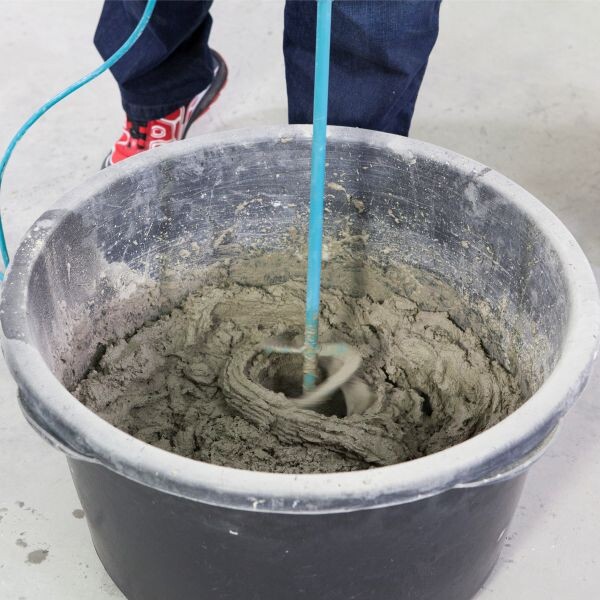 Zum Anmischen des Klebespachtel Allround füllst du einen Mörtelkübel mit Anmachwasser. Die empfohlene Wassermenge findest du auf der Rückseite des Sacks. Anschließend gibst du den Klebespachtel Allround hinzu und rührst ihn solange durch, bis eine homogene, knötchenfreie Masse entsteht. Hierfür eignet sich ein elektrisches Rührwerk besonders gut.