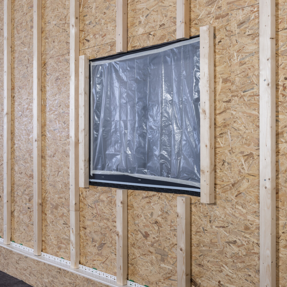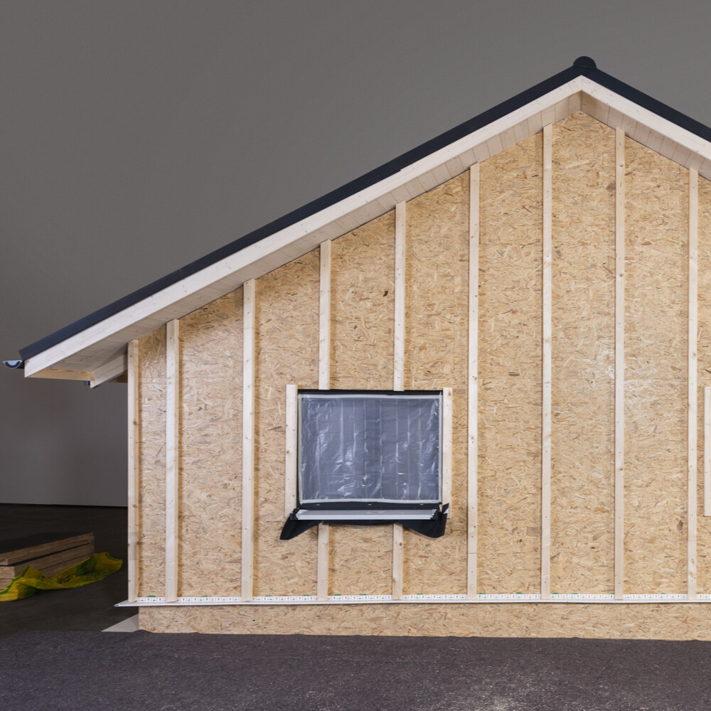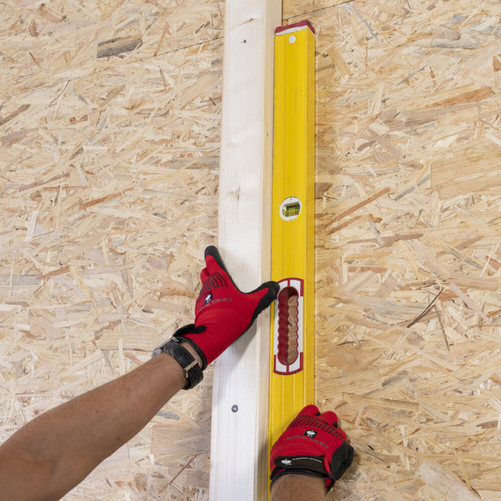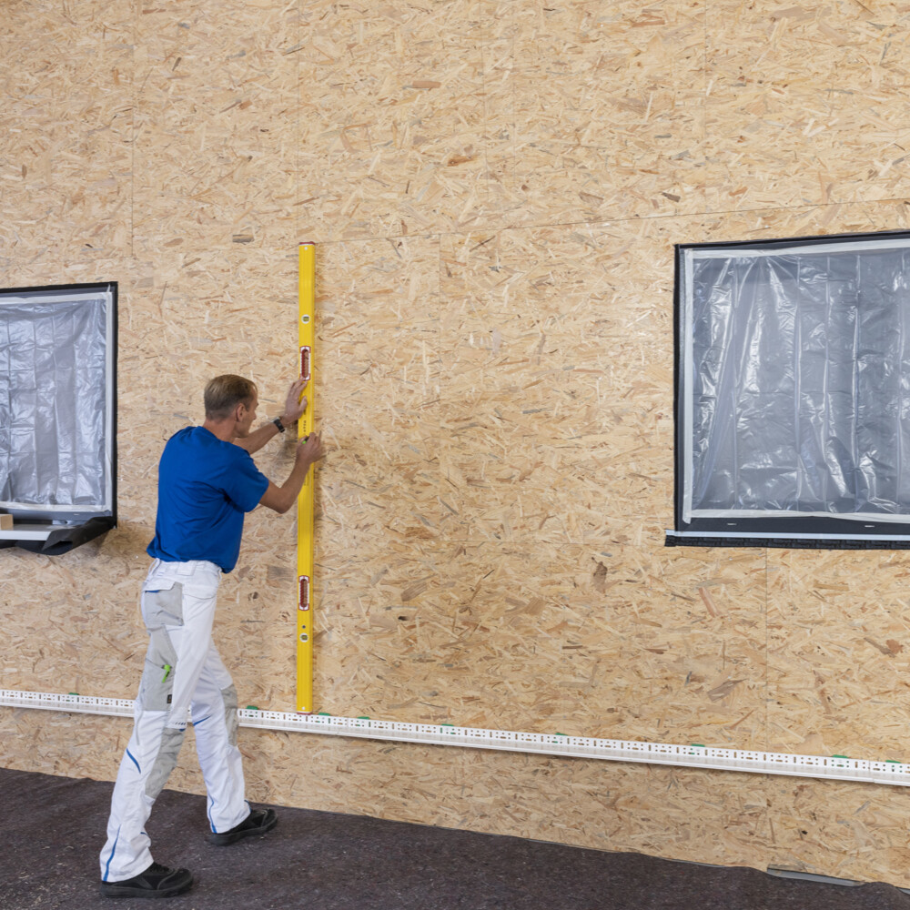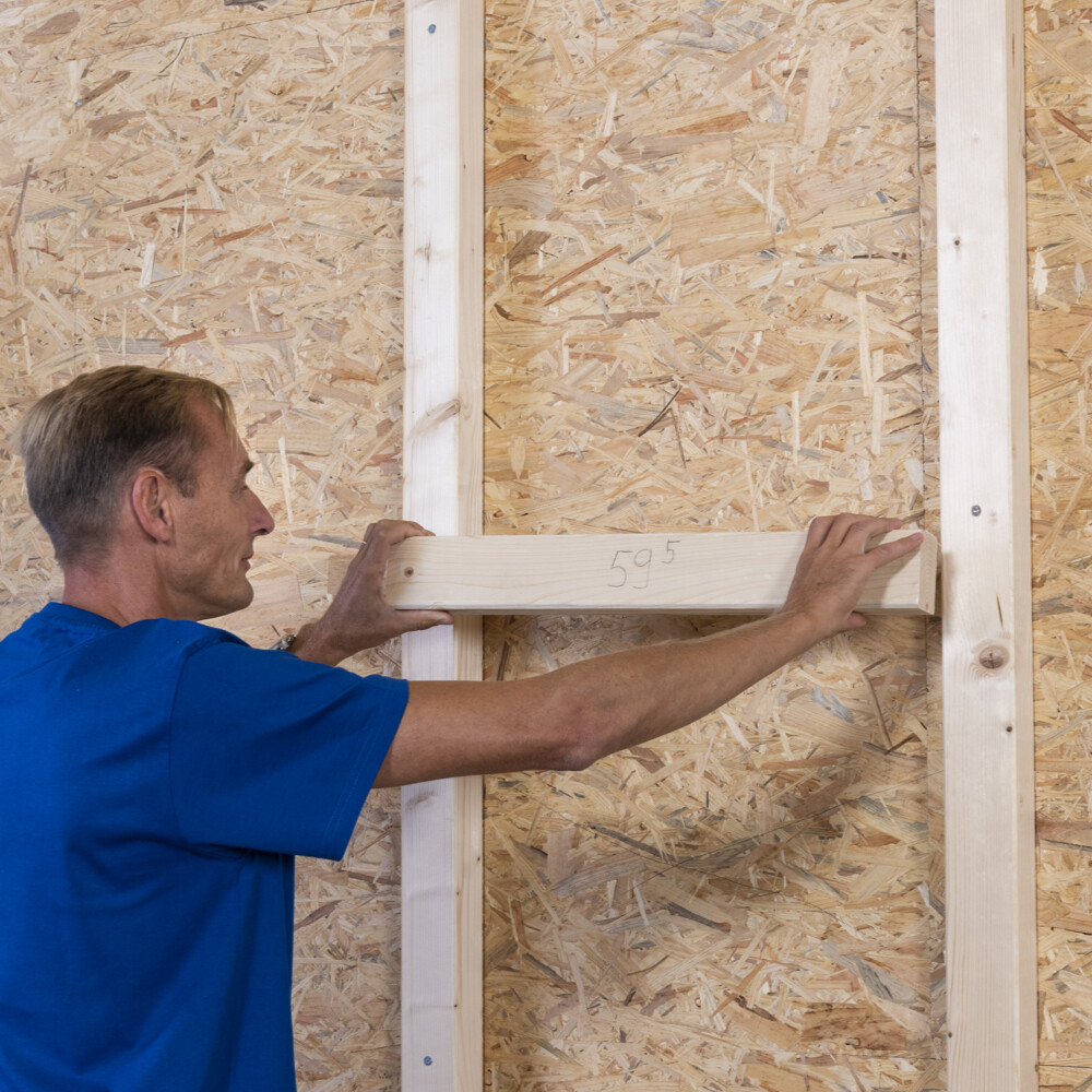 An Öffnungen, wie Fenstern und Türen, wird je nach späterer Ausführungvariante in der Senkrechten ein Tragholz montiert.