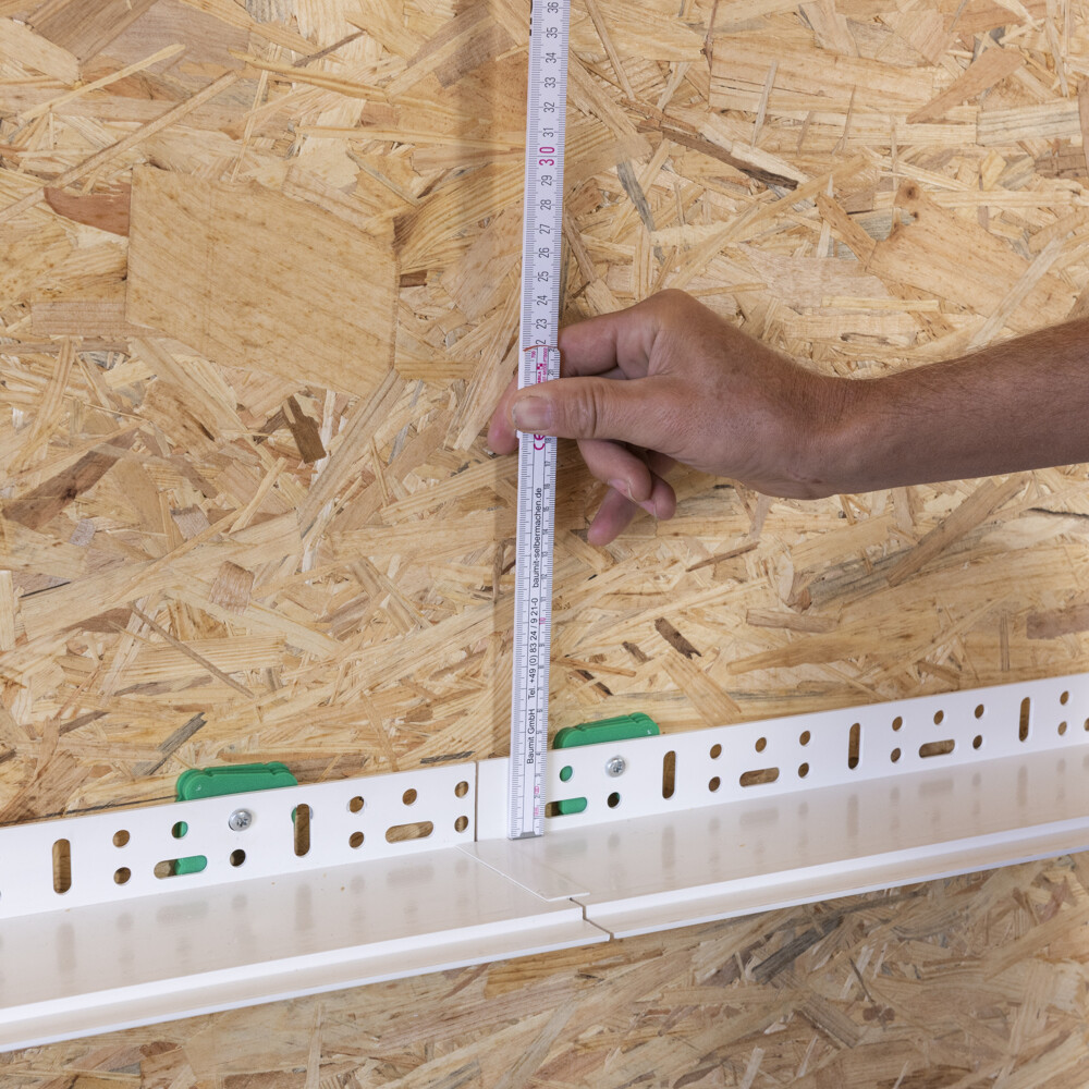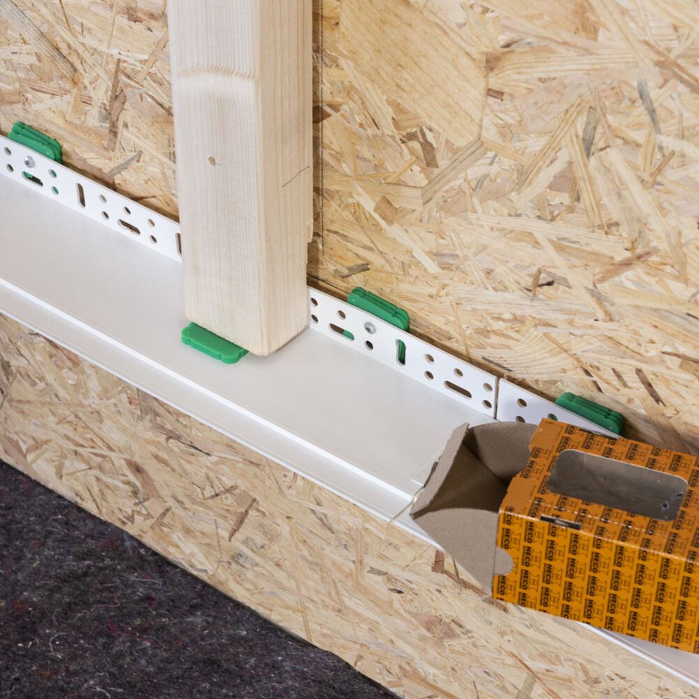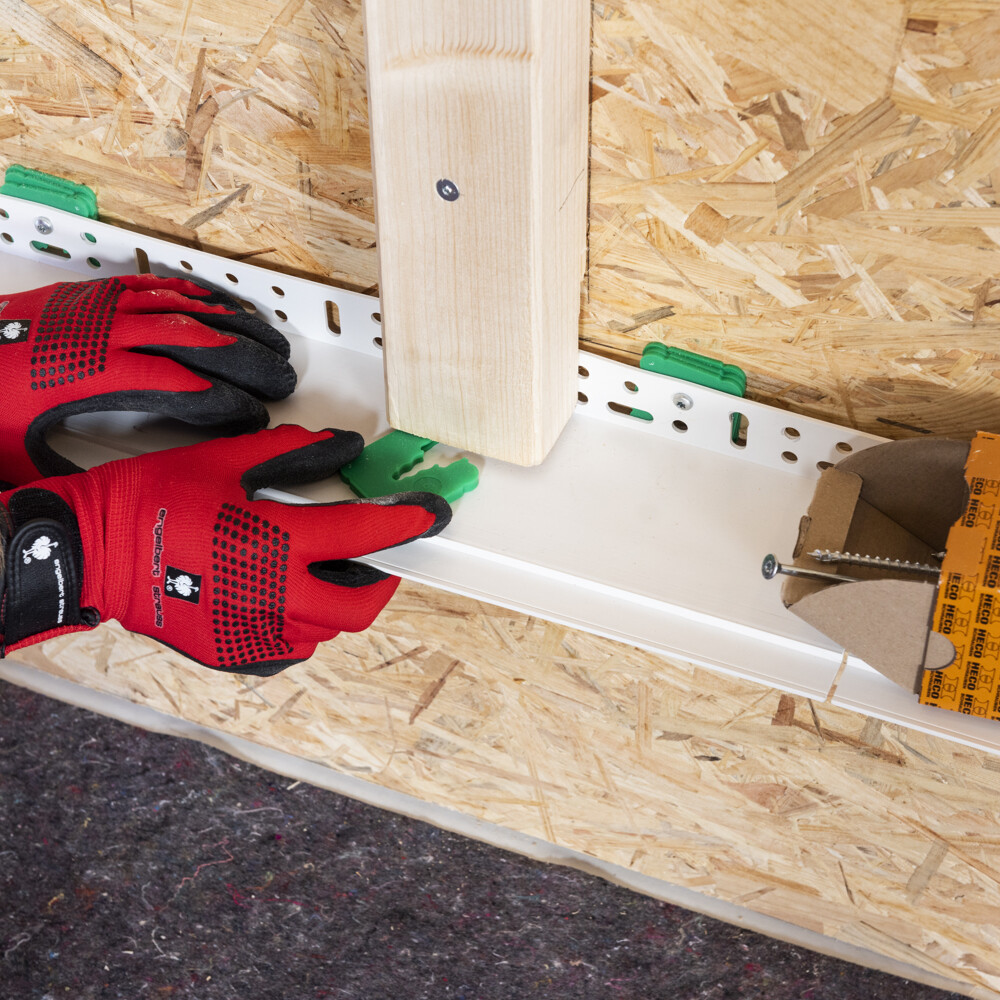 Unsere Beispielkonstruktion mit Holzunterkonstruktion darf nicht im Sockel ausgeführt werden, d.h. sie kann erst ab 30 cm über dem Boden angesetzt werden. In der Anleitung ist das Sockelprofil bereits gesetzt.