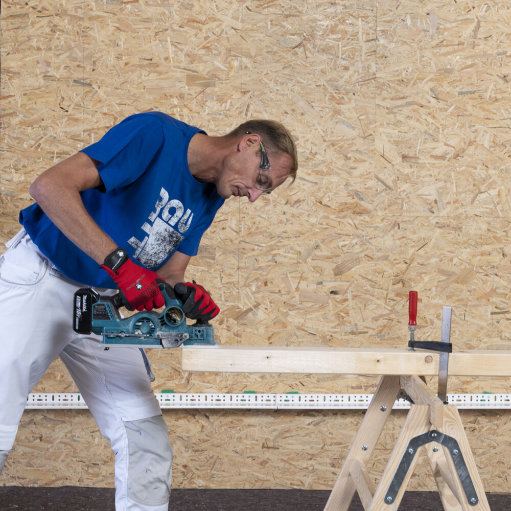 In der Praxis wirst du ca. 5-8 mm aus dem Tragholz für die Anbindung an das Sockelprofil abtragen müssen. Das kannst Du mit einer Säge machen, leichter und schneller geht es mit einem elektrischen Hobel.