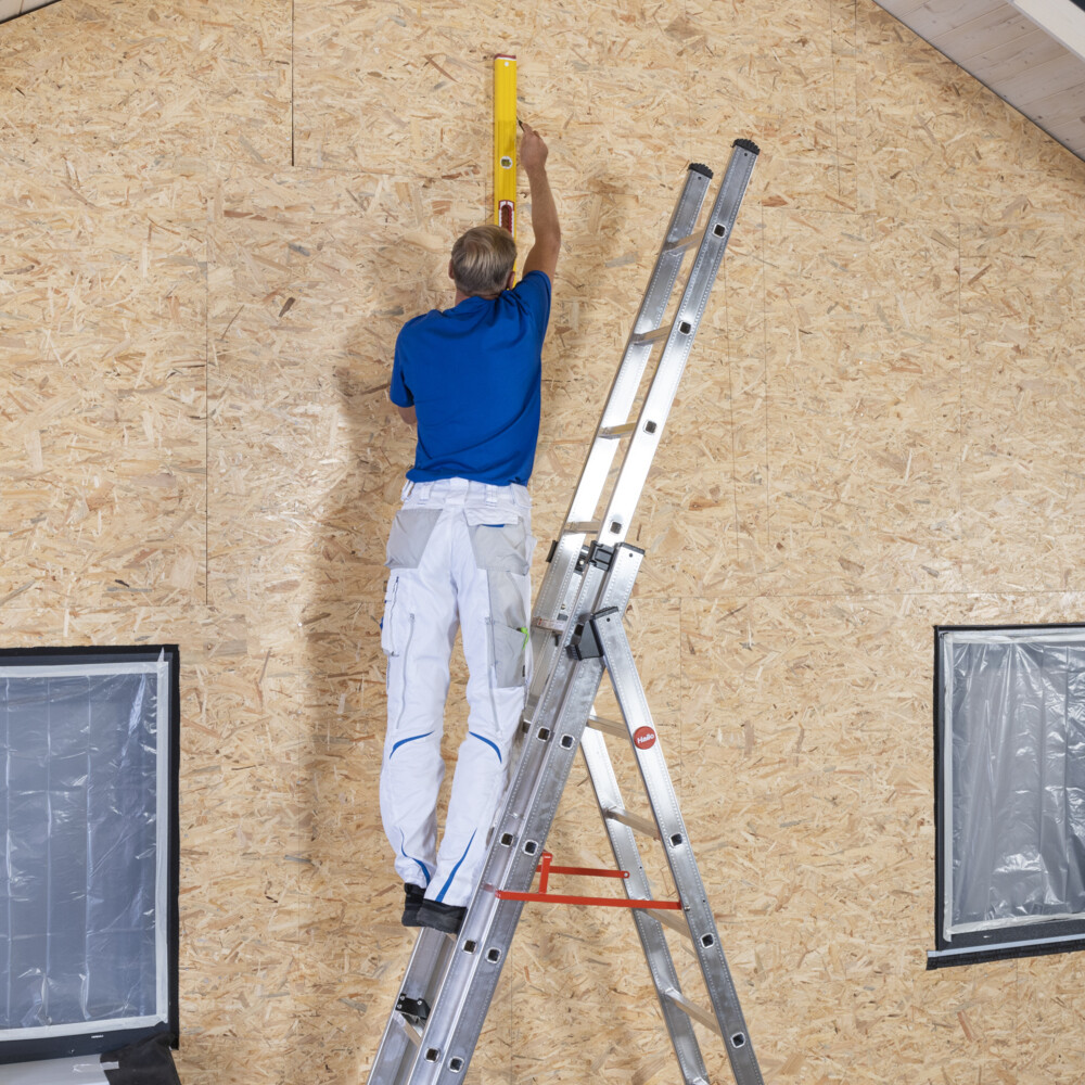 Ist die Fassade zu hoch, markiere die Lage des ersten Tragholzes unter Zuhilfenahme einer Leiter bzw. Gerüsts und langer Wasserwaage mit einem Stift auf dem Untergrund.