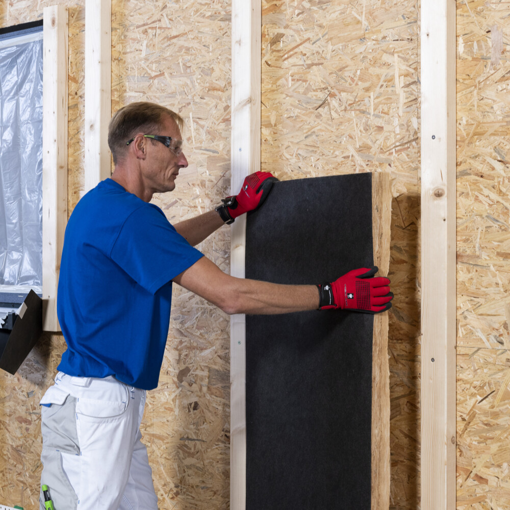 Bei einer doppelten Dämmlage, wie bei unserem Beispiel, kannst du den Abstand der Traghölzer der unteren Lage nach dem eingesetzten Dämmstoff ausrichten, insoweit die Rahmenhölzer in der Wandkonstruktion als Befestigungspunkte dies ermöglichen. Dabei sollte das Achsmaß nicht größer als 62,5 cm sein. Das ist auch das übliche Rastermaß im Holzrahmenbau, also 62,5 cm für den Achsabstand der senkrechten Rahmenhölzer. Der Abstand der Traghölzer der oberen Dämmlage wird vom späteren Deckmaterial (hier eine Fermacell Powerpanel H2O) bestimmt.