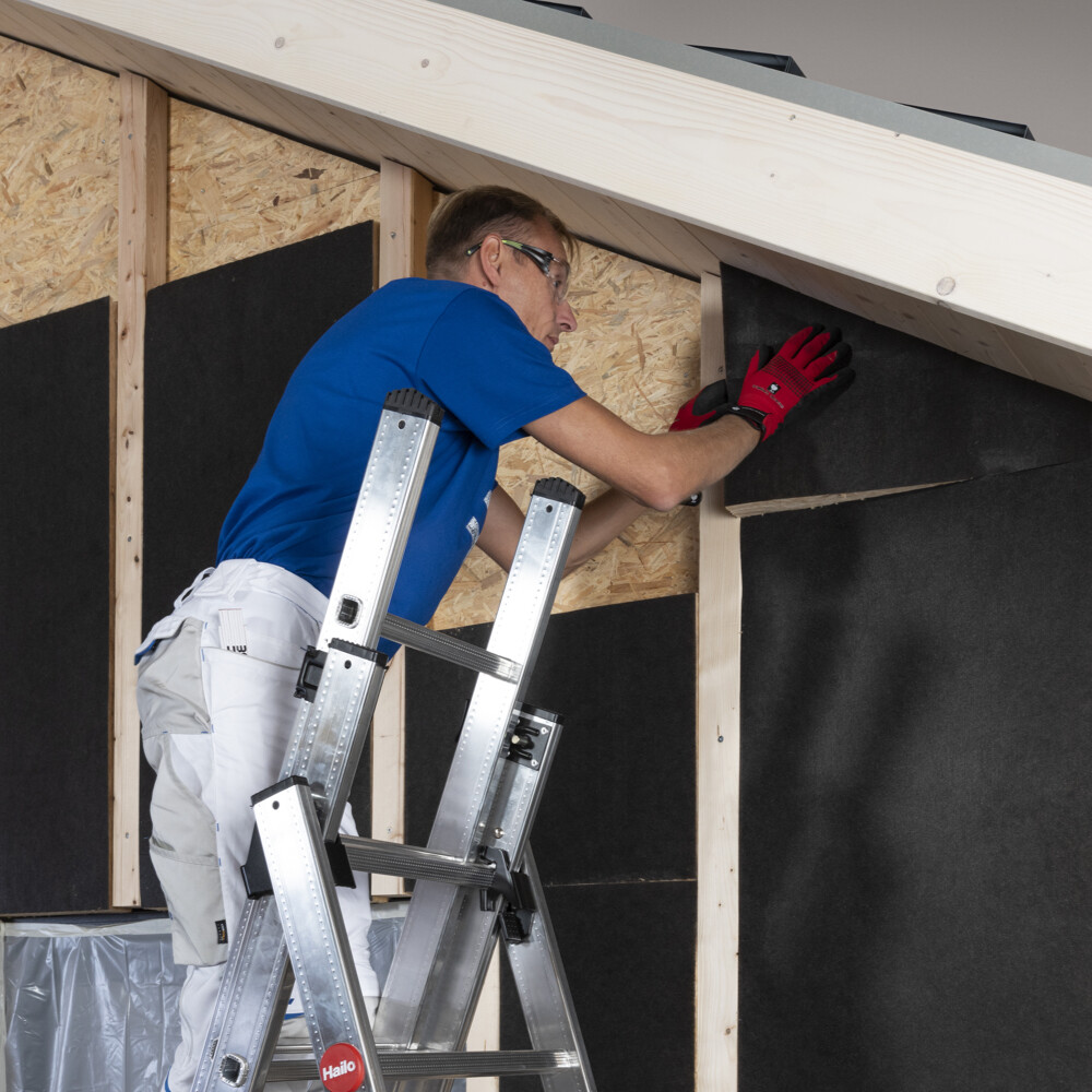 Setze so die nächsten Dämmplatten und achte darauf, dass die Platten untereinander stumpf, ohne Lücken, aneinanderstoßen. Die Mineralwollplatte, wie die hier gezeigte vlieskaschierte Isover Ultimate, verfilzt sehr gut an der Stoßkante und hilft dir beim wärmebrückenfreien Verlegen.