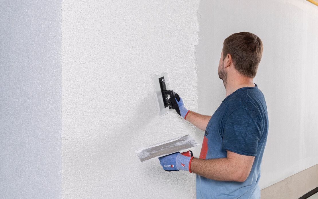 Viele Putze, Mörtel oder Spachtelmassen enthalten alkalische Rohstoffe wie Zement oder Kalk. Ein passender Arbeitshandschuh schützt deine Haut vor direktem Kontakt.
