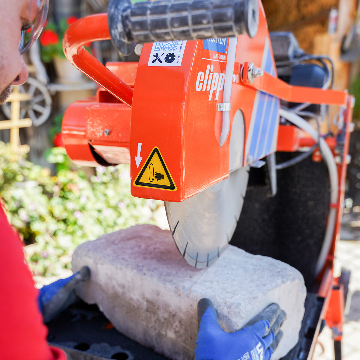Achte auf deine eigene Sicherheit und deine Gesundheit. Trage beim Arbeiten mit einer Steinsäge passende Arbeitskleidung, Arbeitshandschuhe, eine Schutzbrille und einen für diese Arbeiten passenden Gehörschutz. Üblicherweise wird hierfür ein Gehörschutz der Schutzstufe 3 eingesetzt.