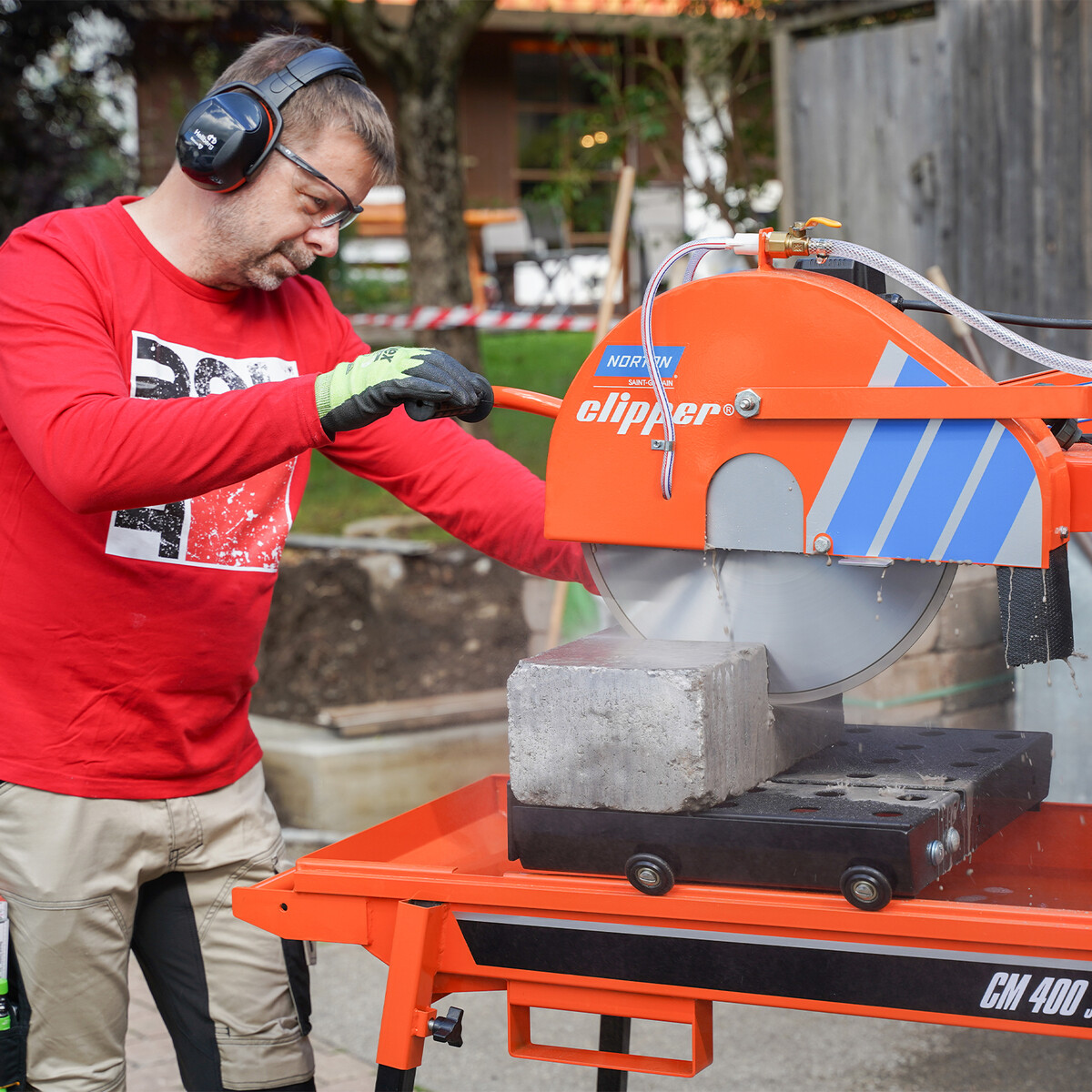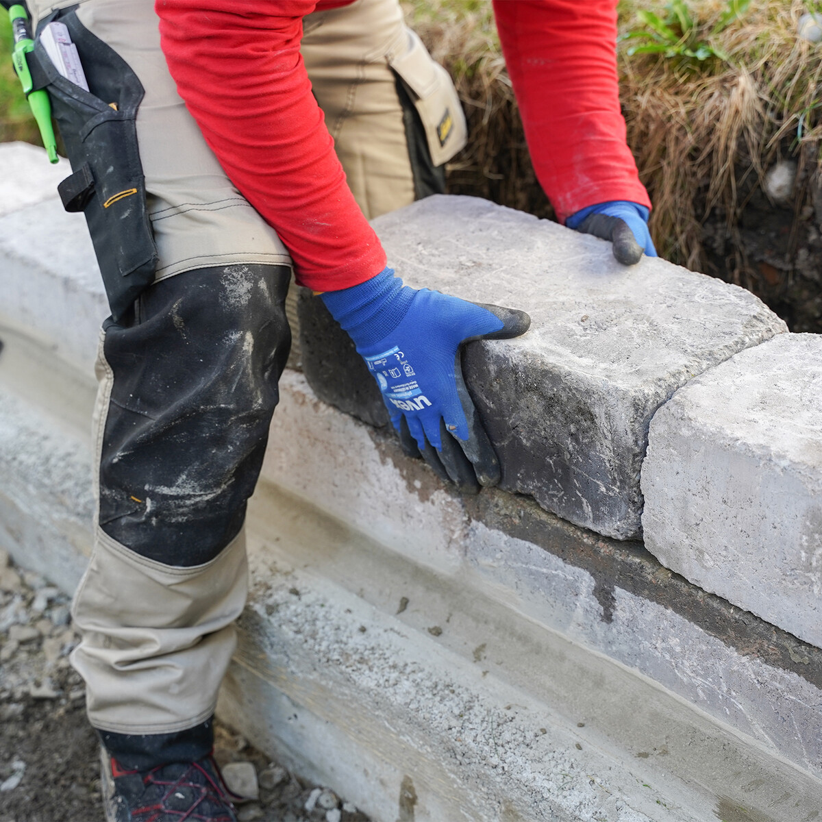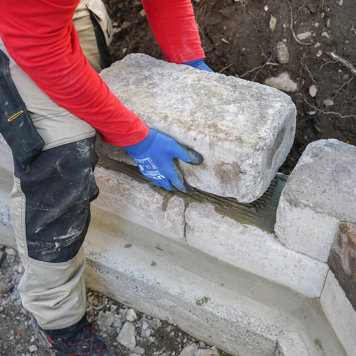 Setze die Gartenmauer auf diese Weise fort. Der Baumit Steinkleber Trass zieht schnell an. So kannst du unmittelbar mit dem Setzen der nächsten Steinreihe weitermachen und die Arbeiten zügig abschließen.