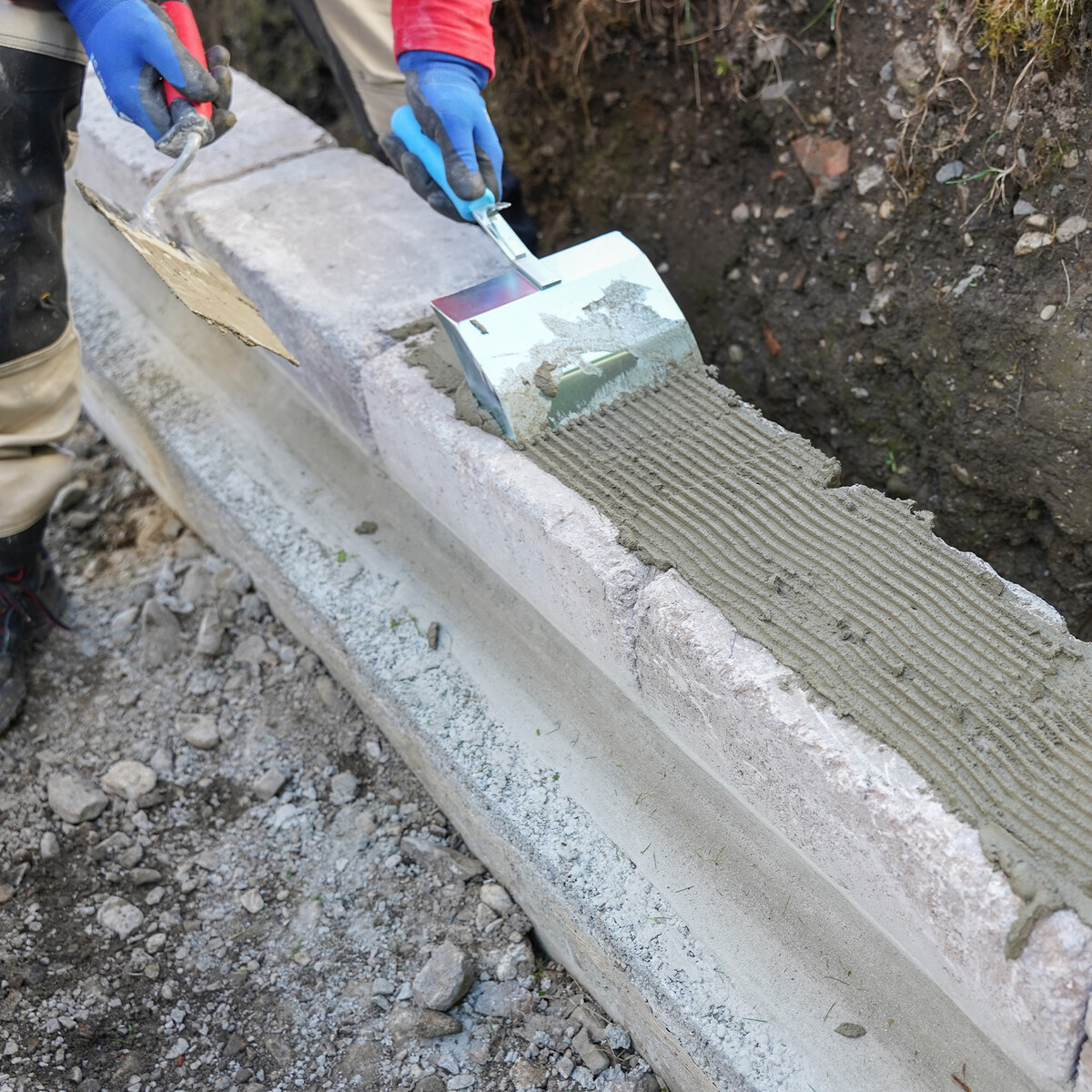Verwende deshalb eine Klebekelle, die schmäler ist als der Mauerstein. So vermeidest du, dass der Steinkleber über die Kanten hinausquillt.
