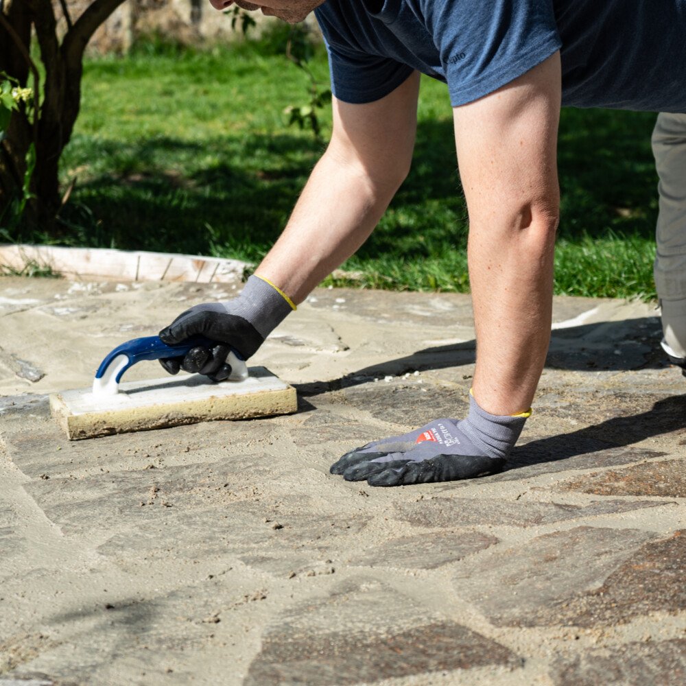 Natursteine und Terrassenplatten mit Pflasterfugenmörtel wasserundurchlässig verfugen