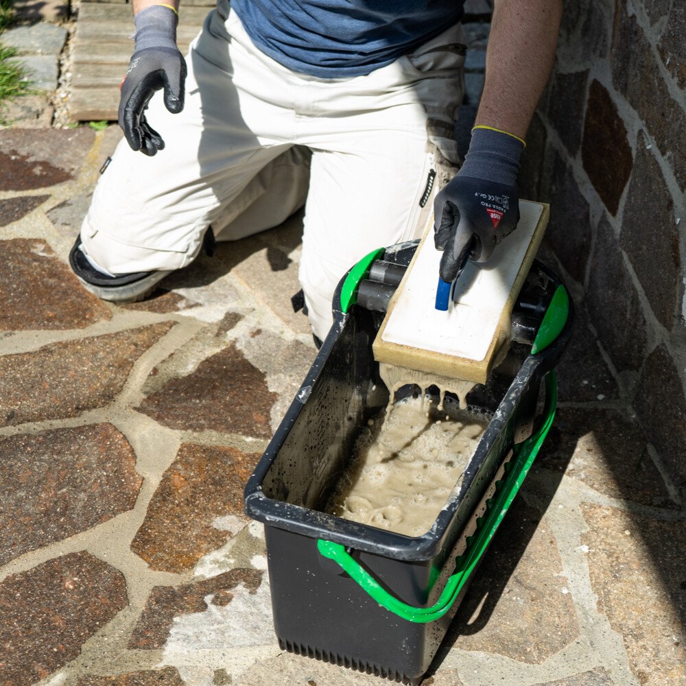 Person gießt Fugenmörtel in die Fugen der Natursteinplatten im Außenbereich.