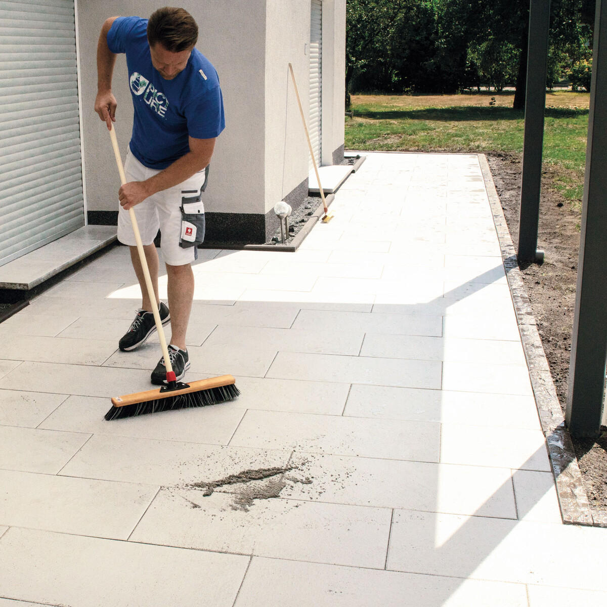 Überflüssiges Material kehrst du mit einem Straßenbesen diagonal zum Fugenverlauf gründlich ab. Ist das Material erst einmal abgebunden und erhärtet, lässt es sich nur sehr schwer mechanisch entfernen.