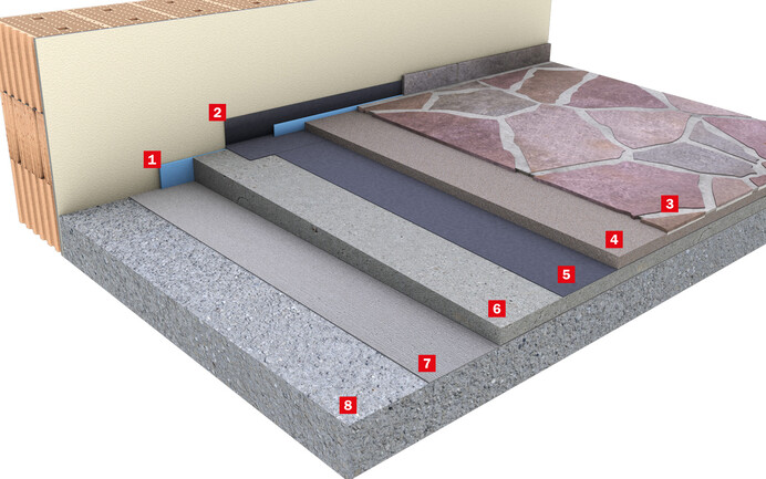 Zuerst wird ein Gefälle weg vom Gebäude erstellt. Mindestdicke: 2,5 cm an der dünnsten Stelle.