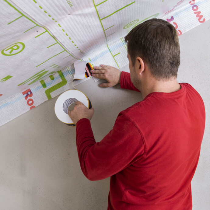 Befreie den Stoßbereich der Dampfbremsbahnen von Staub und Schmutz, z.B. durch Abkehren oder Abwischen und setze das Klebeband an einer Seite der Stoßkante an.