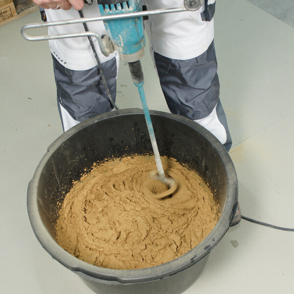 Besonders bei großen Mengen empfiehlt sich der Einsatz eines elektrischen Rührwerkes für das Anmischen den Putzmaterials. Mische das Material solange durch, bis eine homogene, knötchenfreie, gleichmäßige Konsistenz entsteht.