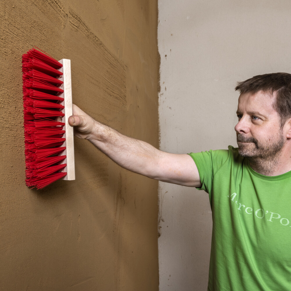 Um die Haftung der zweiten Lage zu verbessern wird der frische Putz mit einem Straßenbesen o.ä. an der Oberfläche aufgeraut. Vor dem Auftragen der zweiten Lage muss die erste Putzlage komplett durchtrocknen. Lehmputz trocknet in der Regel ca. 2 Tage pro Millimeter Putzdicke. Achte auf eine ausreichende Lüftung während der Trocknungszeit.