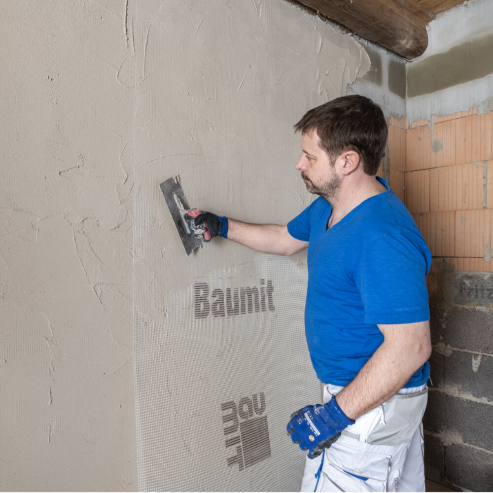 Schneide dir eine Bahn Baumit Armierungsgewebe auf Länge zu und bette die Bahn mit einer Zahnkelle in den frischen Kalkputz ein. Das Armierungsgewebe soll nach dem Einbetten vollständig im oberen Drittel der Putzlage liegen und nicht mehr zu sehen sein.