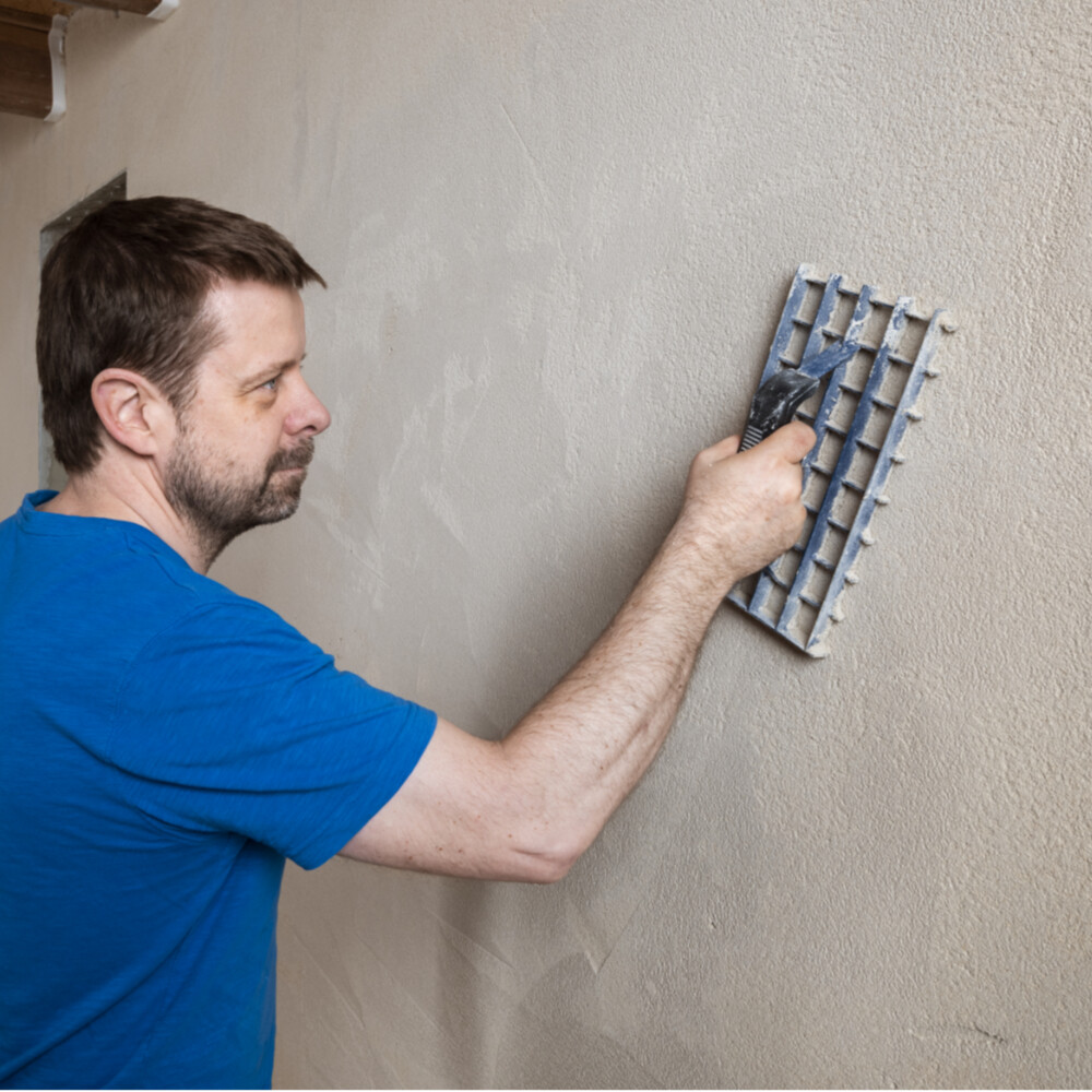 Mit einem Gitterrabot wird nun die Oberfläche rabottiert. Dabei werden Kanten und Stöße beseitigt und die Putzfläche ebenmäßig aufgeraut. Tipp: Mit der Kartätsche oder einer Abziehlatte von 150 bis 180 cm kannst du dabei regelmäßig die Ebenheit des Putzes überprüfen.