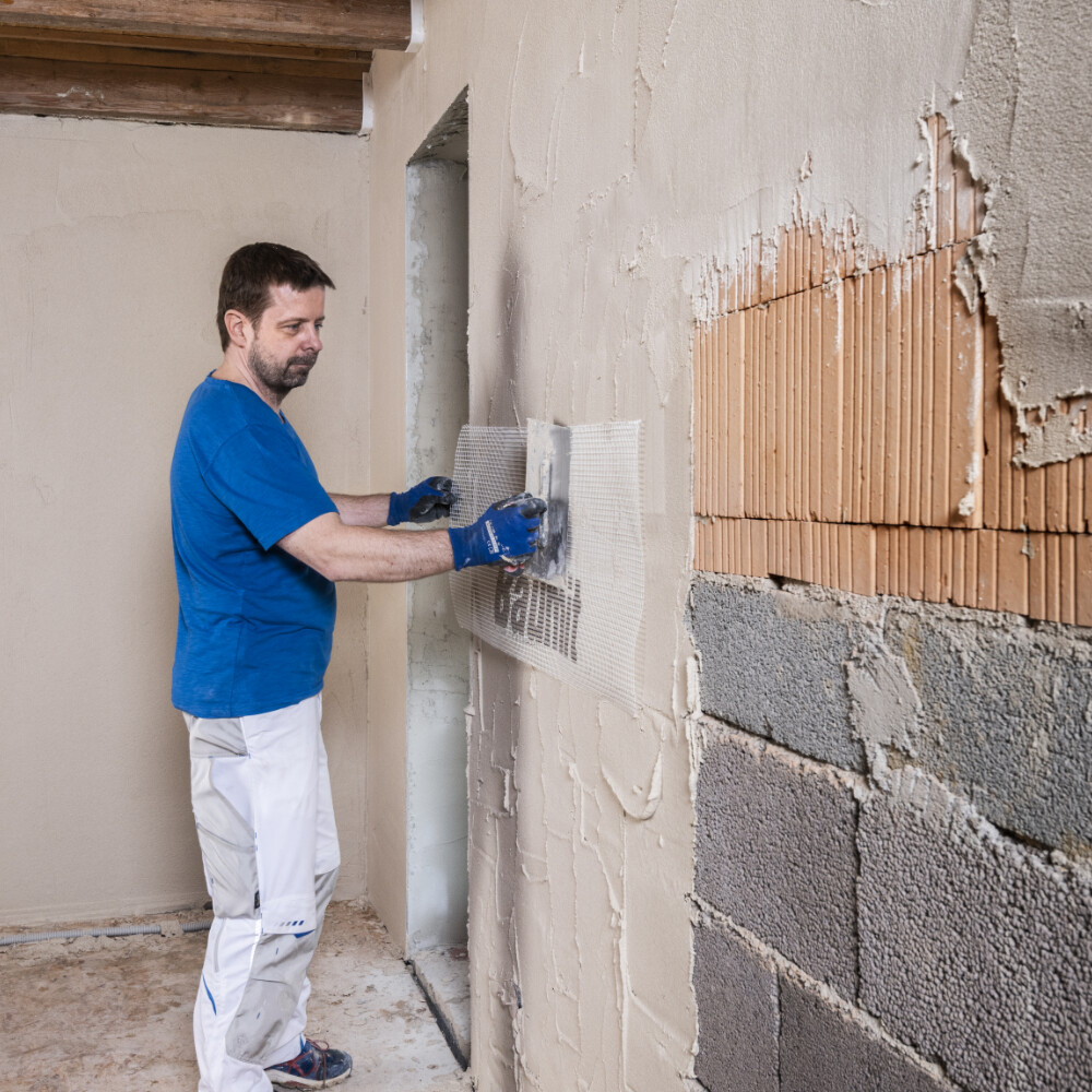 Alternativ zur vollflächigen Armierung kannst du auch im Stoßbereich von verschiedenem Mauerwerk eine Gewebebahn in den frischen Kalkputz einlegen. Dabei sollte der Stoßbereich zu beiden Seiten mindestens 15 – 20 cm überlappt werden.