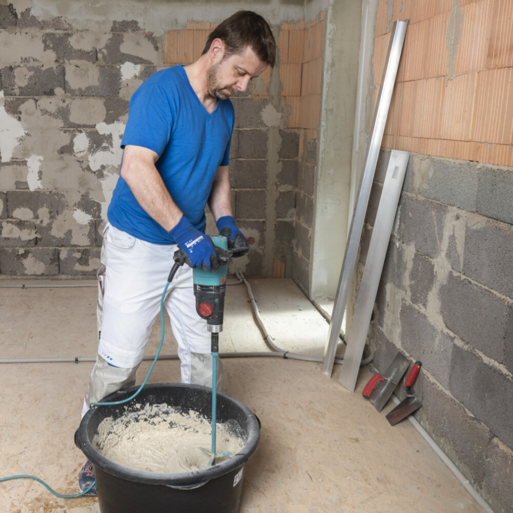 Besonders bei großen Mengen ist zum Anmischen des Putzes ein elektrisches Rührwerke empfehlenswert. Mische das Material solange durch bis eine homogene, knötchenfreie Putzmasse entsteht.