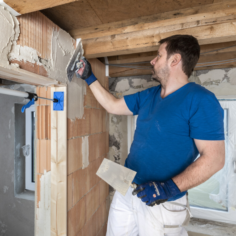 Direkt nach dem Auftragen wird der frische Kalkputz mit einer Kartätsche lot- und fluchtgerecht abgezogen. Hier können zuvor gesetzte Schnellputzleisten eine große Hilfe sein.