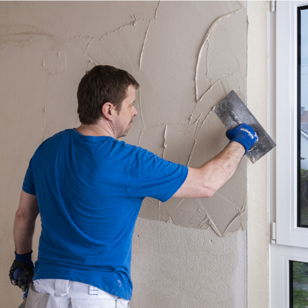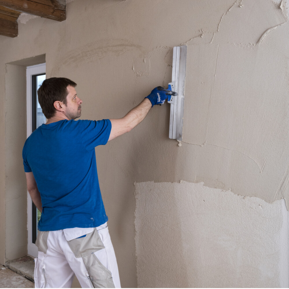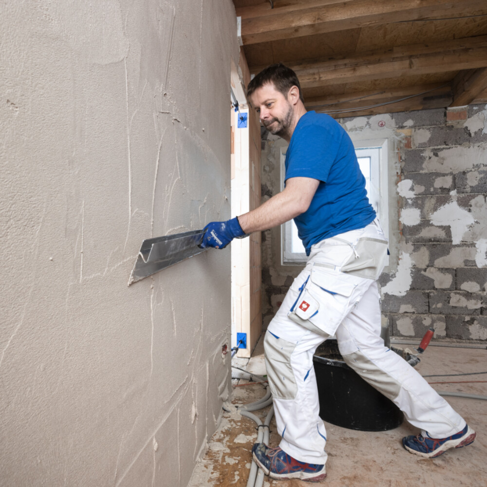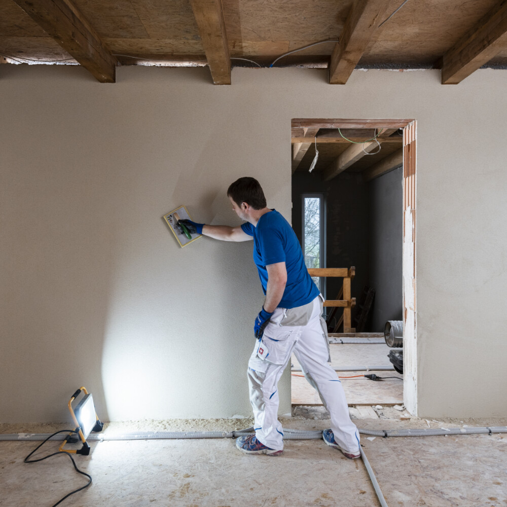 Für möglichst ebene Filzputzflächen ist ein Streiflicht eine große Hilfe. Stelle dir während den Filzarbeiten einen Baustrahler seitlich an die Wand. So kannst du über die Schattenbildung an der Wand sehr gut noch zu bearbeitende Fläche erkennen.