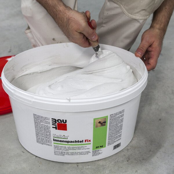 Bevor du mit den Spachtelarbeiten beginnst, rühre bitte den Innenspachtel Fix einmal mit einer sauberen Maurerkelle bis zum Boden auf.