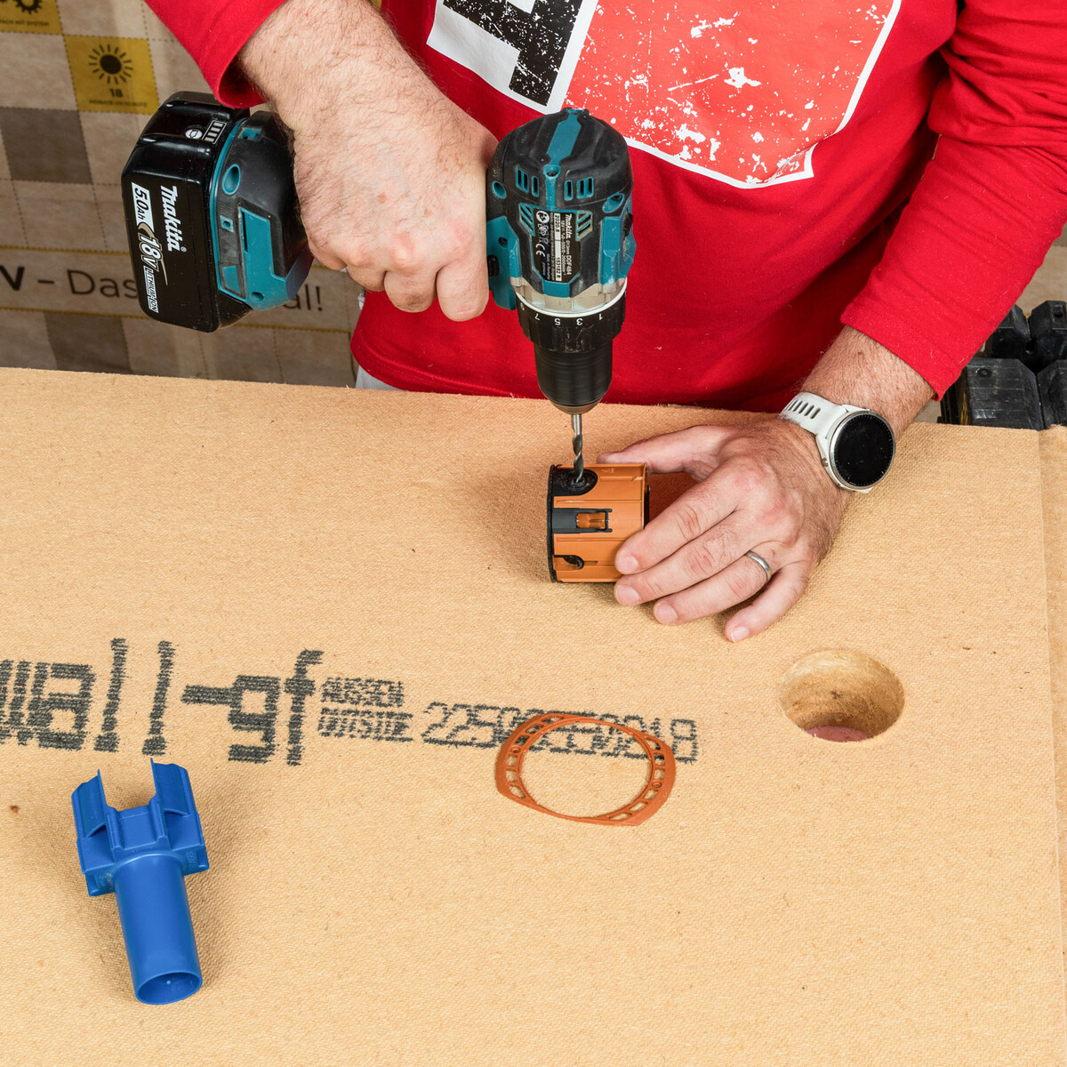 Mit einer Lochsäge für Holzbaustoffe sägst du nun das Loch für die Gerätedose. Für die Kaiser Geräte-Verbindungsdose ECON® Iso+ benötigst du eine Lochsäge mit 68 mm Durchmesser.