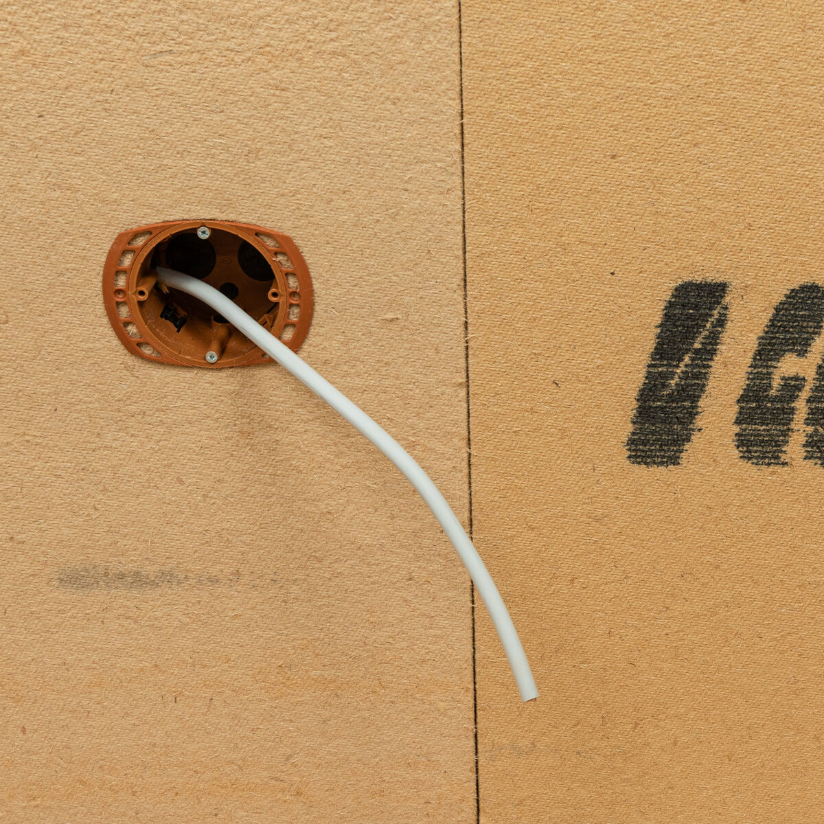 Beim Anbringen der Dämmplatte fädelst du das Kabel durch das gebohrte Loch der Gerätedose.