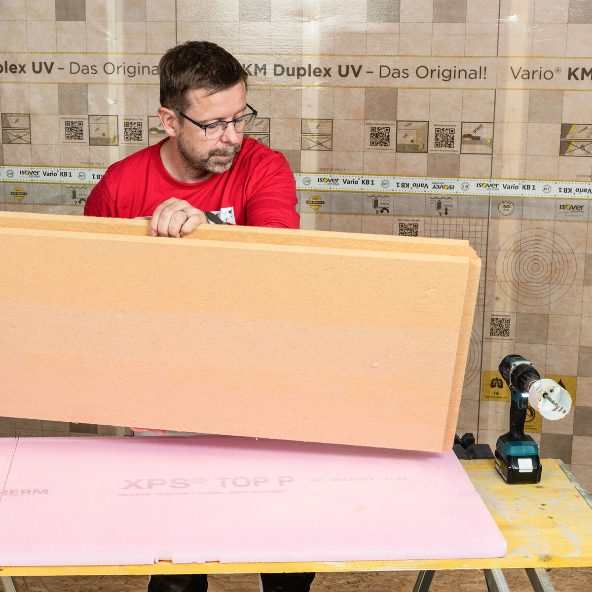 Säge nur so weit, bis der Führungsbohrer die Unterseite durchdringt. Drehe dann die Platte um und stelle den Sägeschnitt von der anderen Seite fertig. So erhältst du auf beiden Seiten der Dämmplatte saubere Kanten.